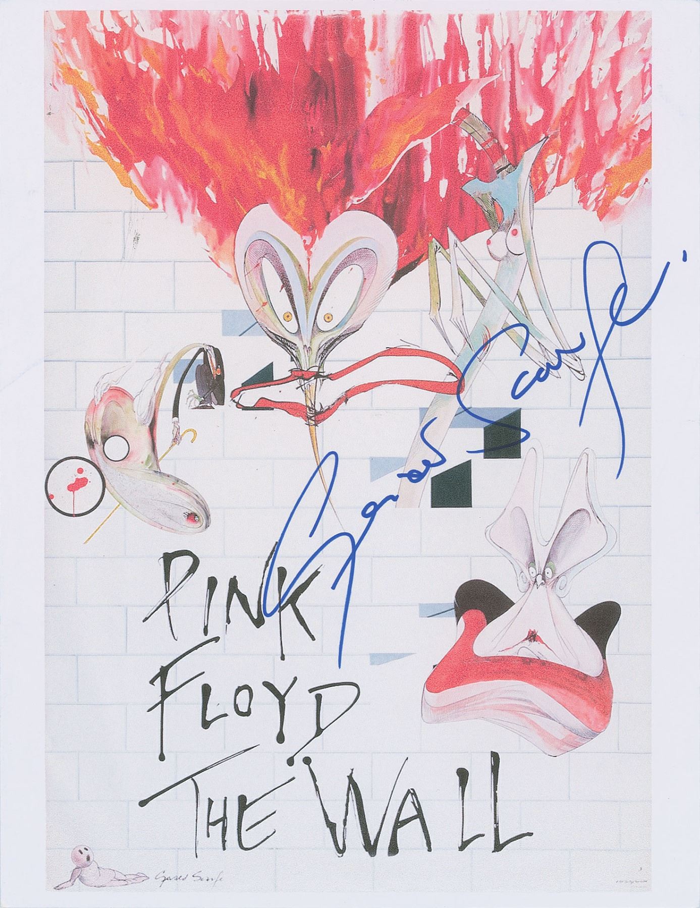 English cartoonist and illustrator (born 1936) who worked on Pink Floyd's 1979 album The Wall, its 1982 film adaptation, and the subsequent tour in 1980-81; he was also an editorial cartoonist for The Sunday Times and illustrator for The New Yorker. Color 8.5 x 11 heavy paperstock photo of a vintage poster designed by Gerald Scarfe and promoting Pink Floyd's The Wall, signed in blue felt tip by Scarfe. In very fine condition.