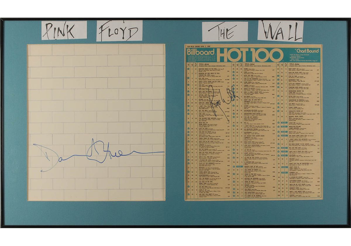 Two items: The Wall album, signed on the front cover in blue felt tip by David Gilmour; and Billboard magazine’s Hot 100 page from April 5, 1980, featuring ‘Another Brick in the Wall,’ as No. 1, signed in blue felt tip by Roger Waters. Both are matted and framed together to an overall size of 26.5 x 16. In fine condition, with uniform mild toning to Billboard page. Oversized.