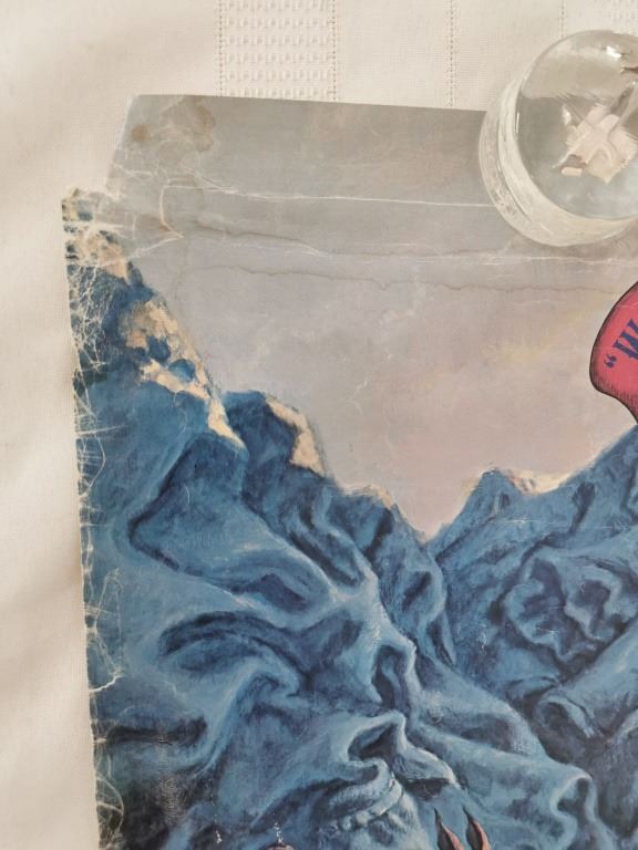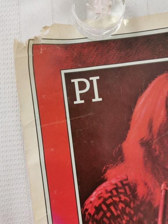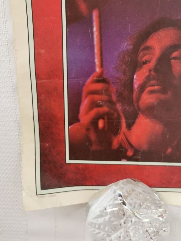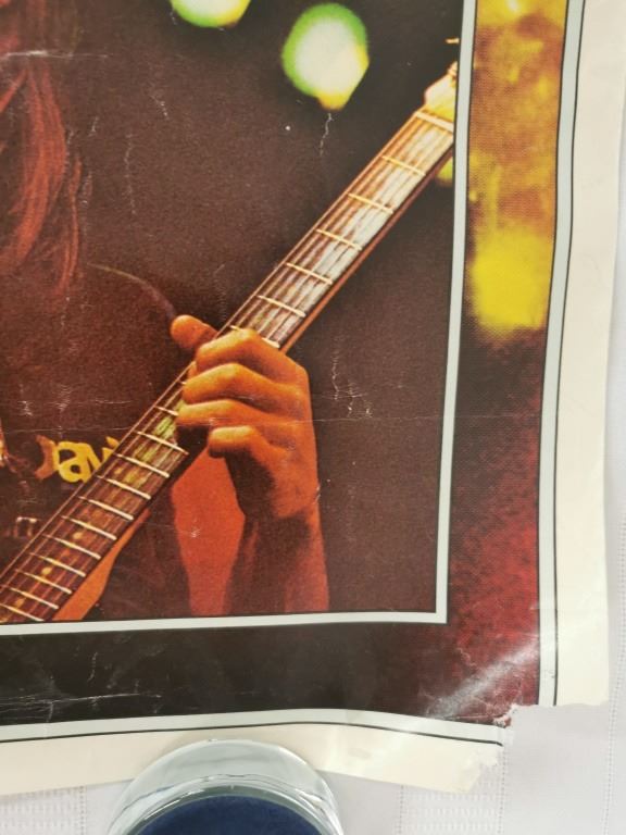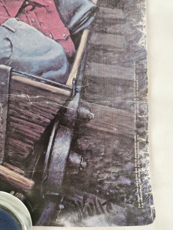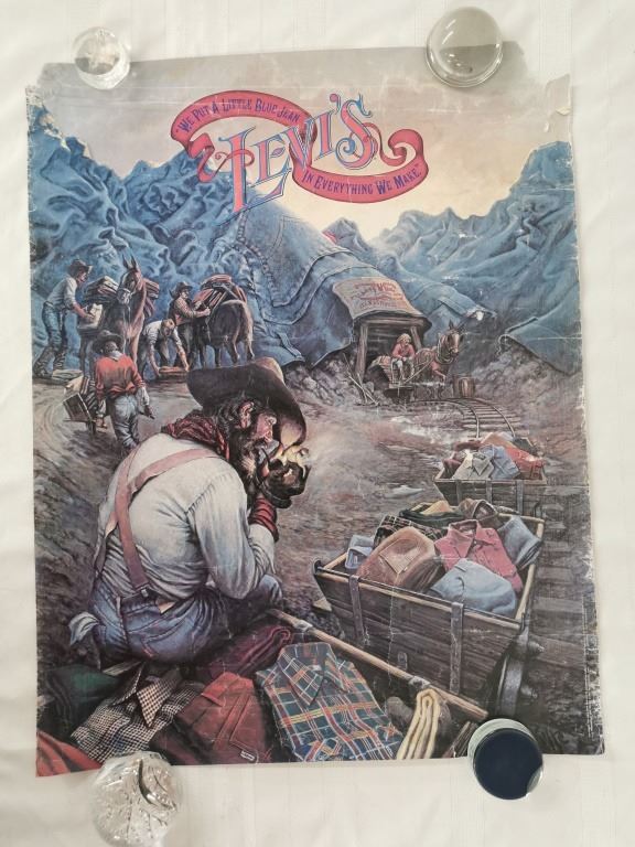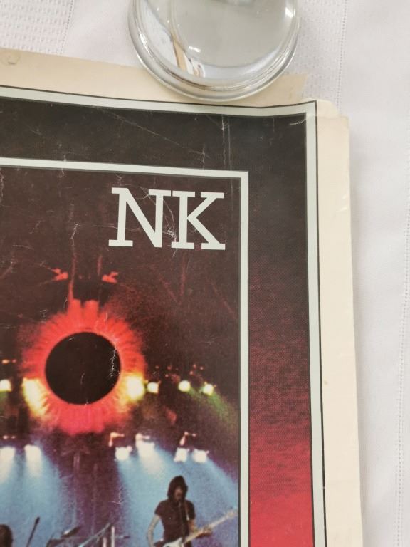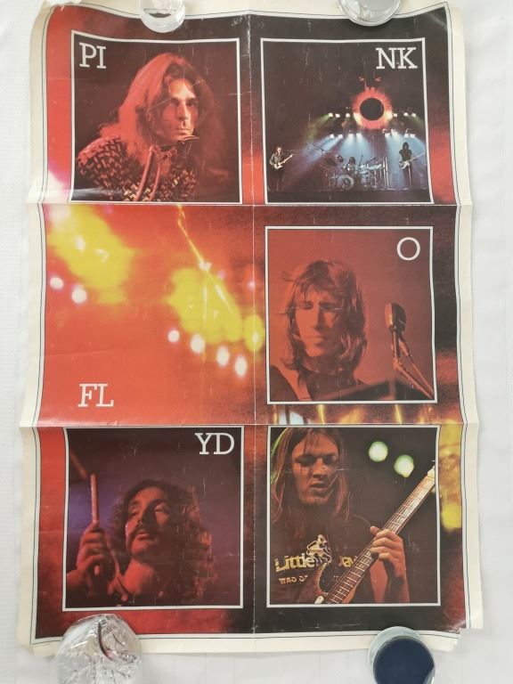 Pink Floyd Dark Side Of The Moon live 20 x 29.5 live in concert collage poster circa 1973 in fair condition. Has creases from being in album, and three torn corners. It comes wrapped in a vintage Levis Poster that is also included in this lot.
