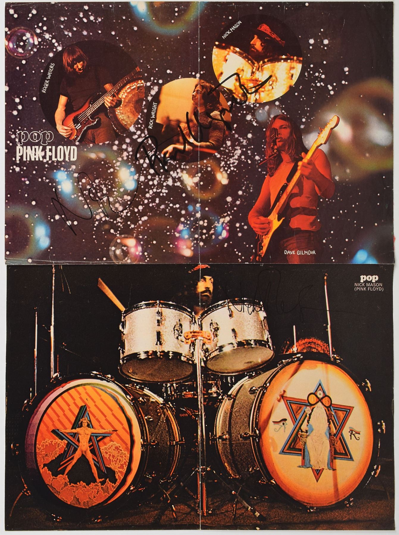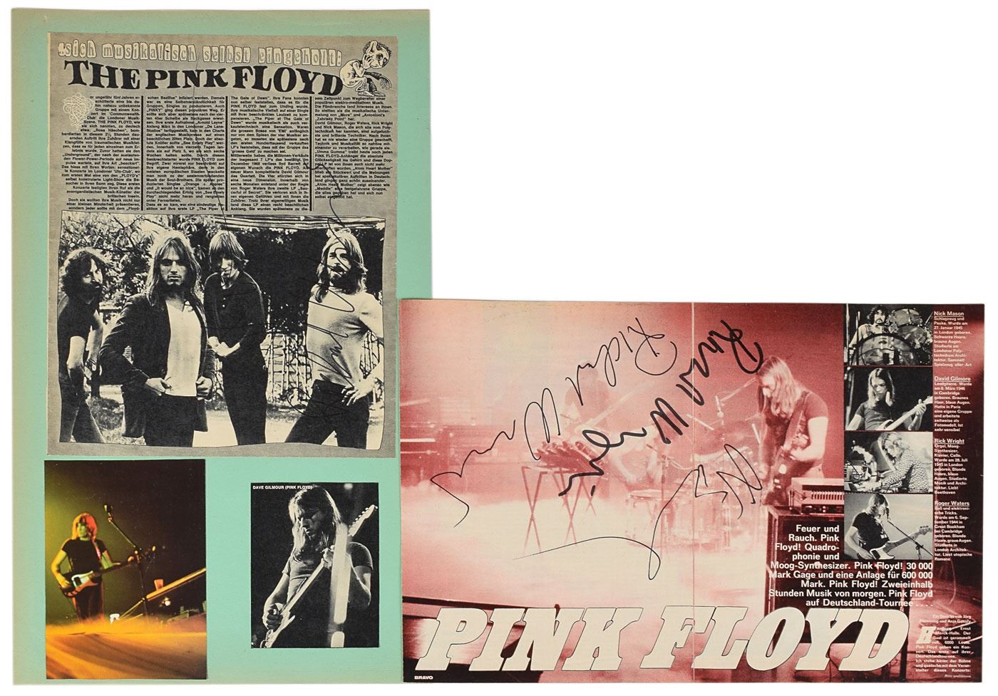 Four vintage German magazine photos of Pink Floyd, ranging in size from 16.25 x 11.25 to 10 x 12.25, three photos signed in black felt tip by Nick Mason and Richard Wright (who signs one photo twice), and one photo signed only by Mason. In overall very good to fine condition. Consignor notes that these vintage signatures were obtained in person in Vienna during the early to mid-1970s.