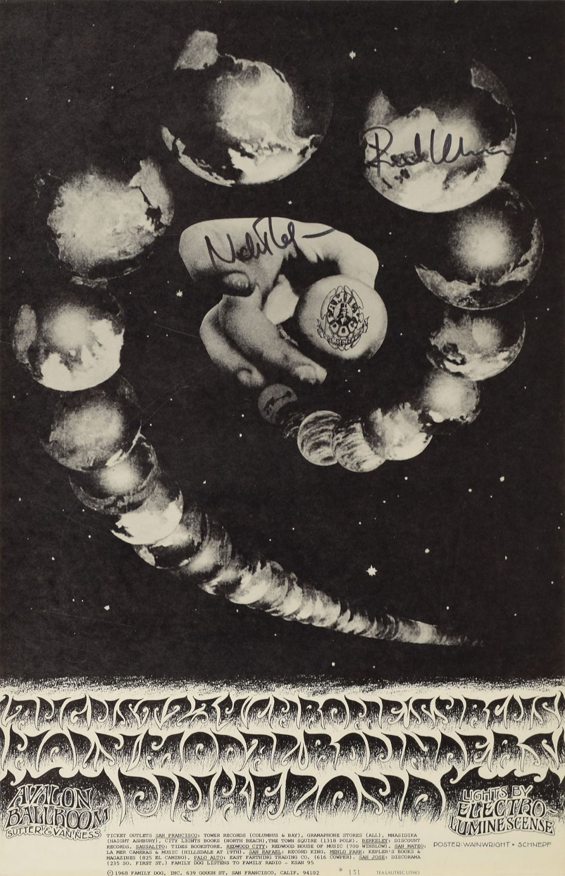 Vintage Family Dog poster for a Pink Floyd concert at the Avalon Ballroom in San Francisco, California, on August 2–4, 1968, 14 x 21.5, listing supporting acts as Chrome Syrcus and Holy Modal Rounders, signed in black felt tip by Richard Wright and Nick Mason. Rolled and in fine condition.
