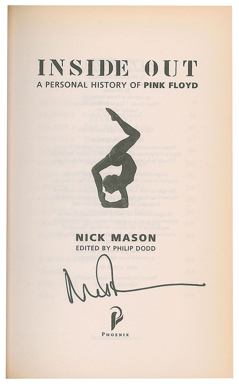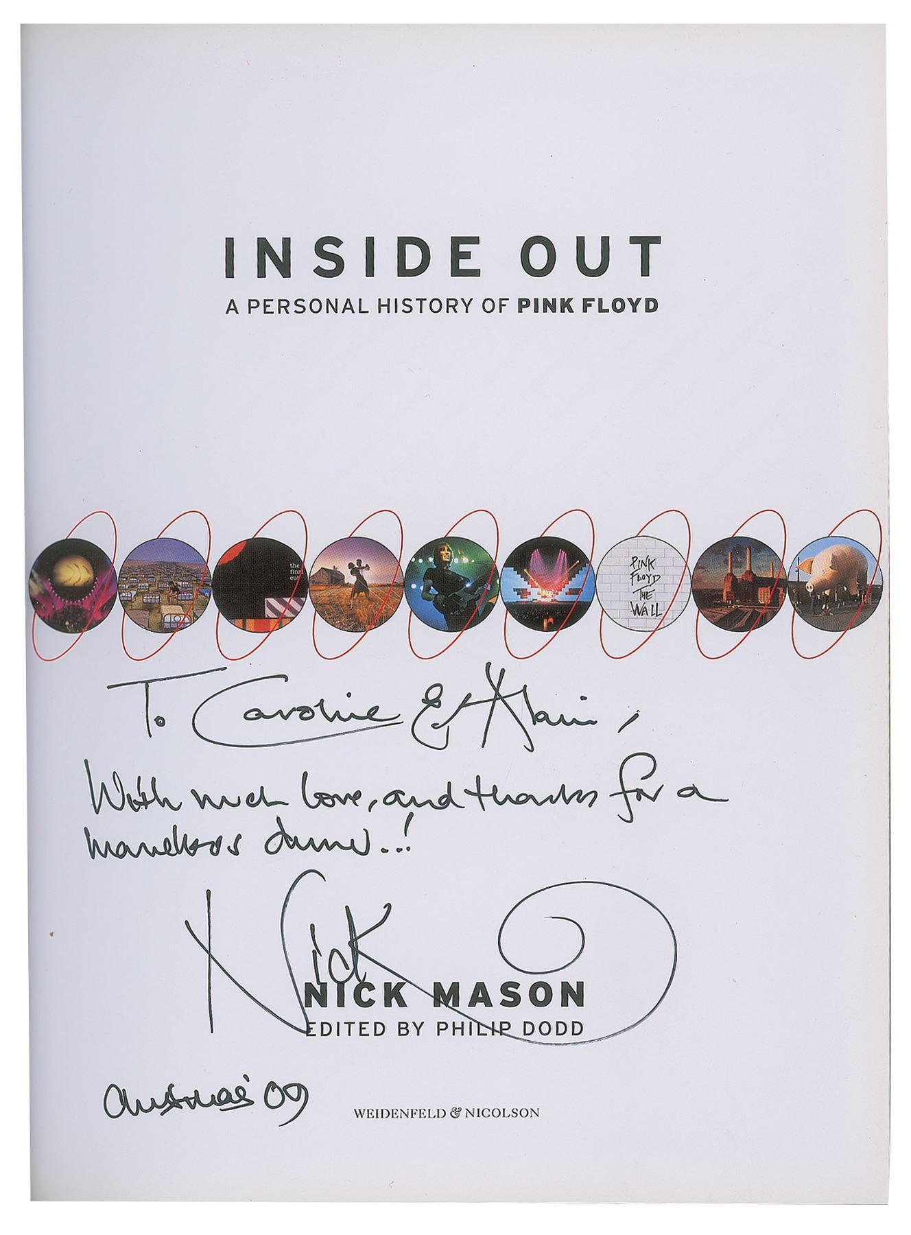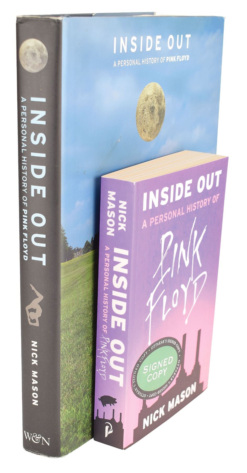 Two books: a first paperback edition of Inside Out: A Personal History of Pink Floyd, published by Phoenix in 2005, signed on the title page in black ink, "Nick Mason"; and a first edition of Inside Out: A Personal History of Pink Floyd, hardcover with dust jacket, published by Weidenfeld & Nicholson in 2004, signed and inscribed on the title page in black felt tip, "To Caroline & Alain, With much love, and thanks for a marvelous time…! Nick, Christmas '09." In overall fine condition.