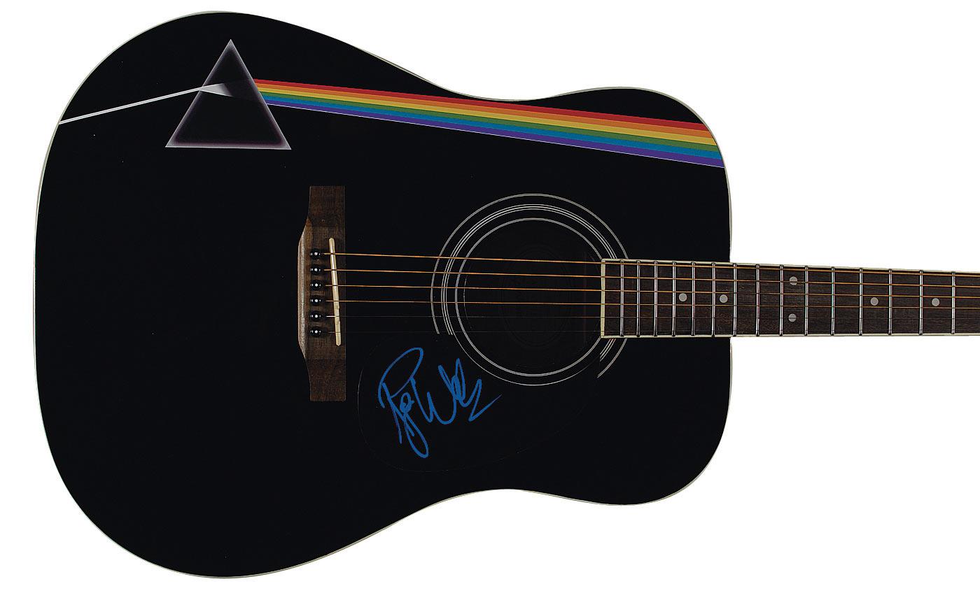 Black-bodied Epiphone six-string acoustic guitar, with a ‘Dark Side of the Moon’ design on the body, signed on the black pickguard in blue ink. In fine condition. Oversized.