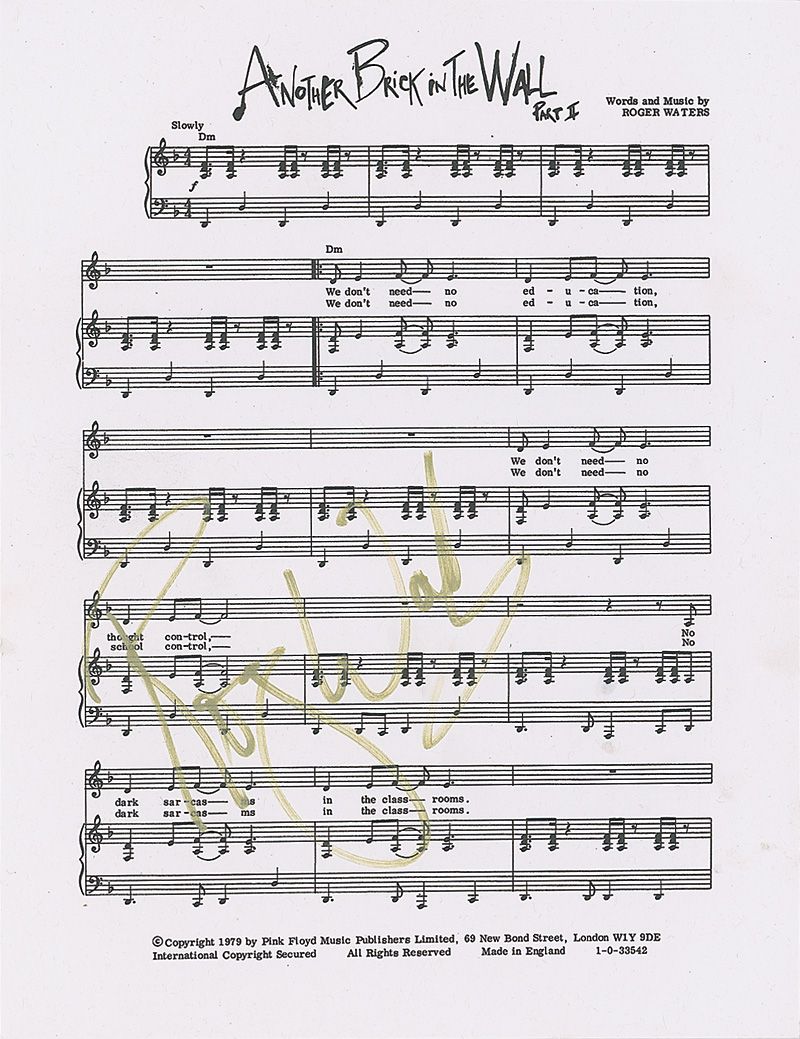 Sheet music to ‘Another Brick in the Wall,’ on three white 8.5 x 11 cardstock sheets, signed on the first page in gold ink by Waters. In very fine condition.