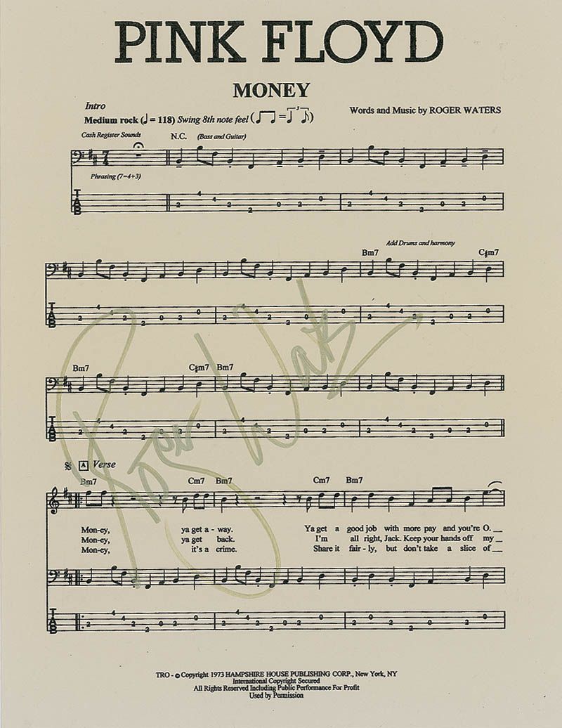 Printed sheet music to ‘Money,’ on five beige 8.5 x 11 cardstock pages, signed on the first page in gold ink by Waters. In fine condition.