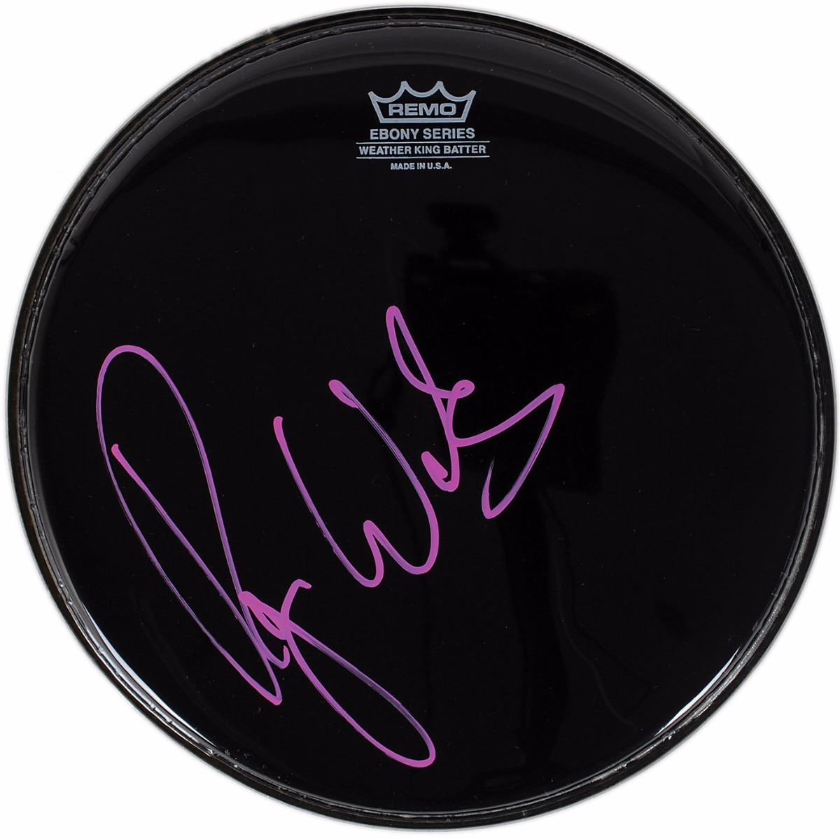Black Remo drumhead, 10.5? in diameter, signed in pink ink by Roger Waters. In fine condition.