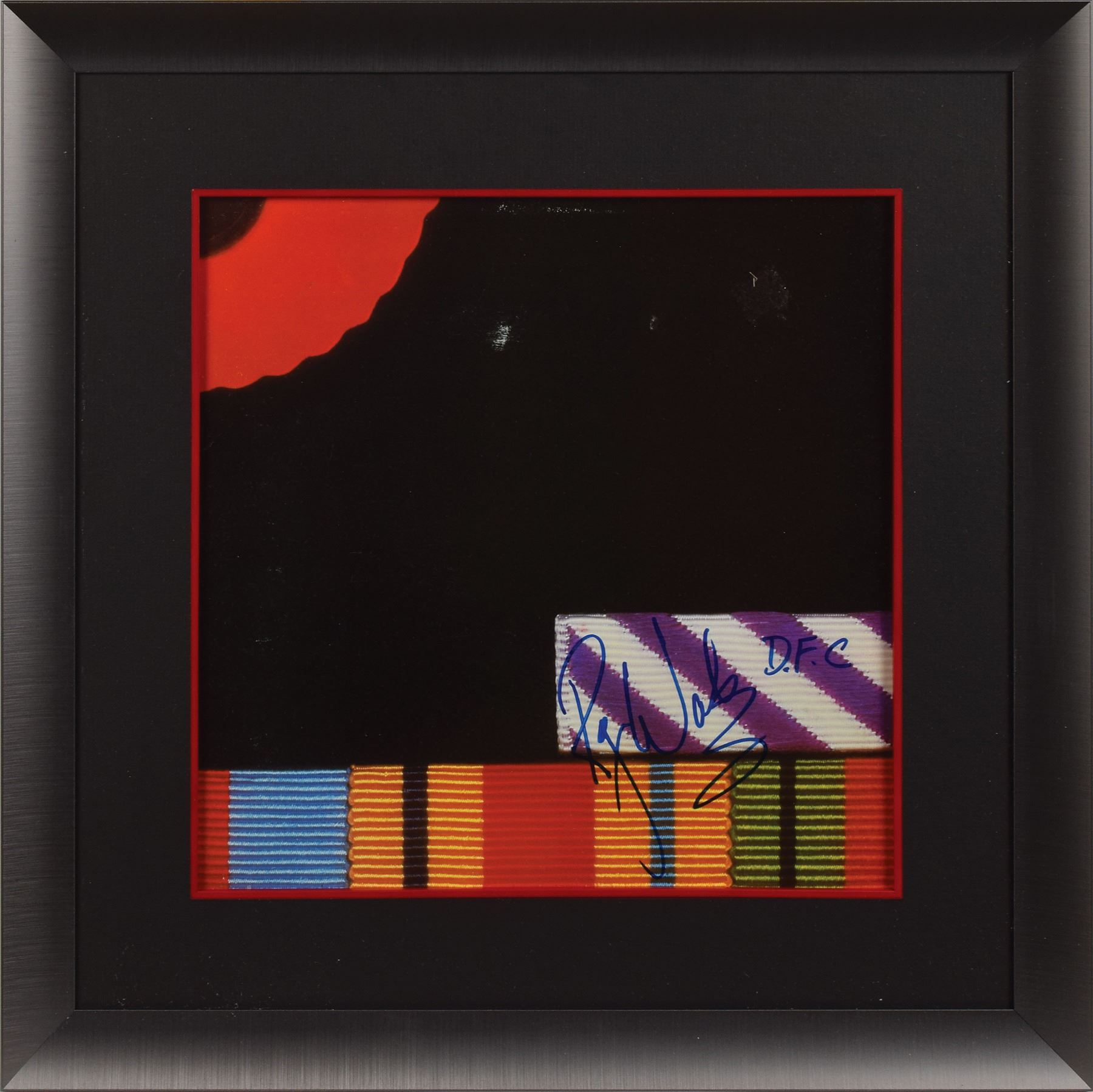 The Final Cut album signed on the front cover in blue felt tip, "Roger Waters, D.F.C," which stands for 'Distinguished Flying Cross,' and is depicted on the cover. Matted and framed to an overall size of 18.5 x 18.5. In fine condition, with light scuffing and scratching, and old price sticker residue to the upper right background area. Accompanied by a full letter of authenticity from REAL.