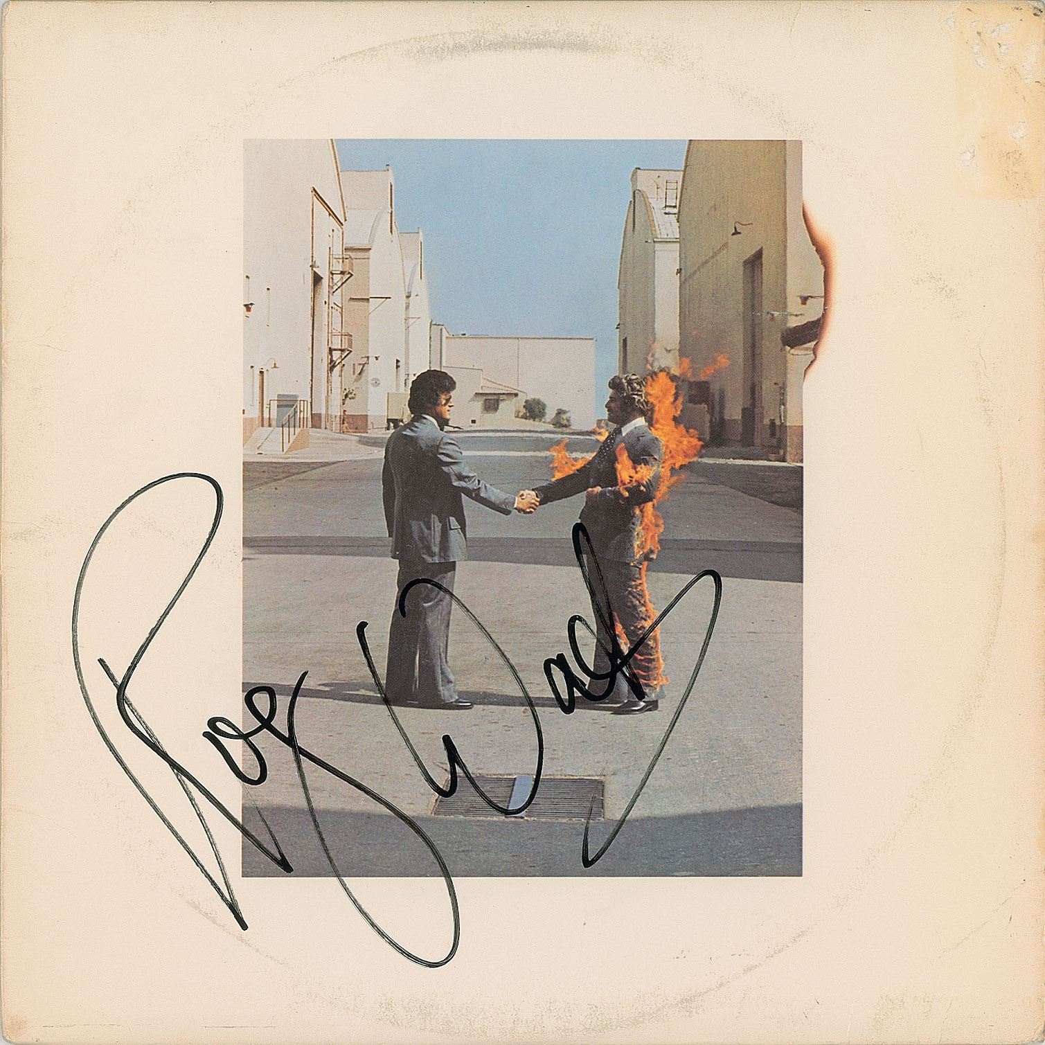 Wish You Were Here album signed on the front cover in black felt tip by Waters. In very good condition, with light scuffing and soiling, old sticker residue to the upper right, and a small tear to the spine. The record is included. Consignor notes that the signature was obtained prior to a Waters show at Cleveland's Quicken Loans Arena.