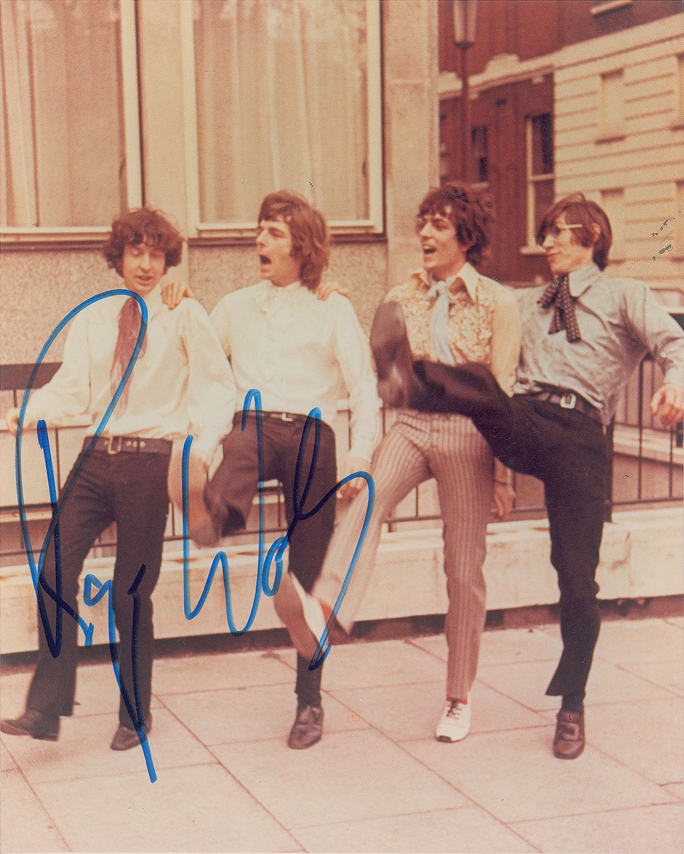Color satin-finish 8 x 10 photo of Pink Floyd performing a kickline outside of EMI Records in 1967, signed in blue felt tip by Waters. In fine condition. Originally obtained by in-person specialist Mike Wehrmann.