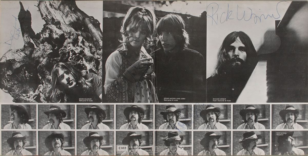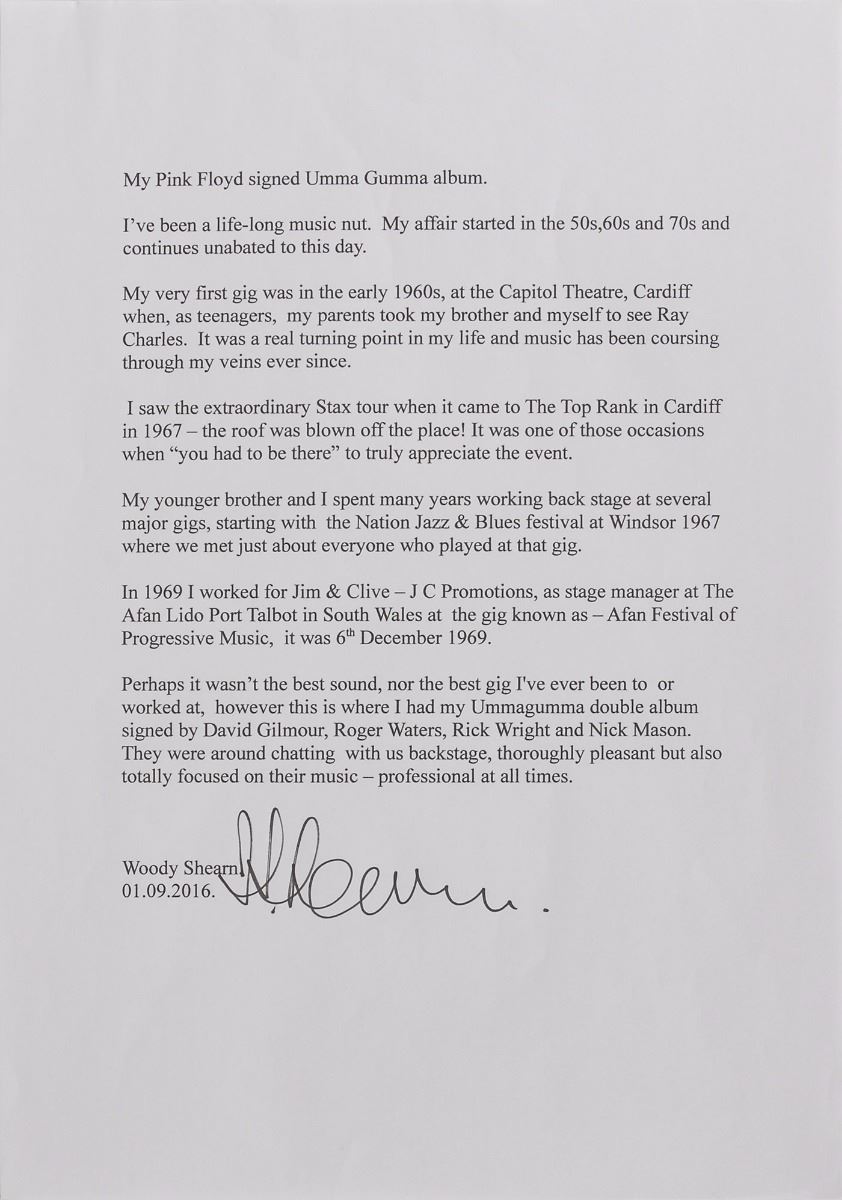 Ummagumma album signed on the gatefold in blue ballpoint by Nick Mason, Rick Wright, Roger Waters, and David Gilmour. In fine condition. The records are included. Accompanied by a certificate of authenticity from Tracks and a letter of provenance from the original recipient, in part: “In 1969 I worked for Jim & Clive—J C Promotions, as stage manager at The Afan Lido Port Talbot in South Wales at the gig known as—Afan Festival of Progressive Music, it was 6th December 1969...this is where I had my Ummagumma double album signed.” An extremely desirable vintage fully signed album.