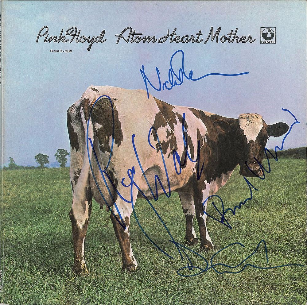 Atomic Heart Mother album signed on the front cover in blue felt tip by Roger Waters, Nick Mason, Richard Wright, and David Gilmour, who also signs on the inner gatefold. In fine condition. The record is not included. Originally obtained by in-person specialist Mike Wehrmann. The release of Atom Heart Mother in 1970 marked the first instance in which a Pink Floyd album would top the UK charts. Although the band have distanced themselves from the record, with Gilmour admitting that they were 'scraping the barrel a bit at that period,' the amusing bovine artwork represents the band's subtle humor, as well as their desire to branch away from the 'space rock' imagery they were becoming pigeonholed. A notably uncommon title with a full cast of bold Floyd signatures.