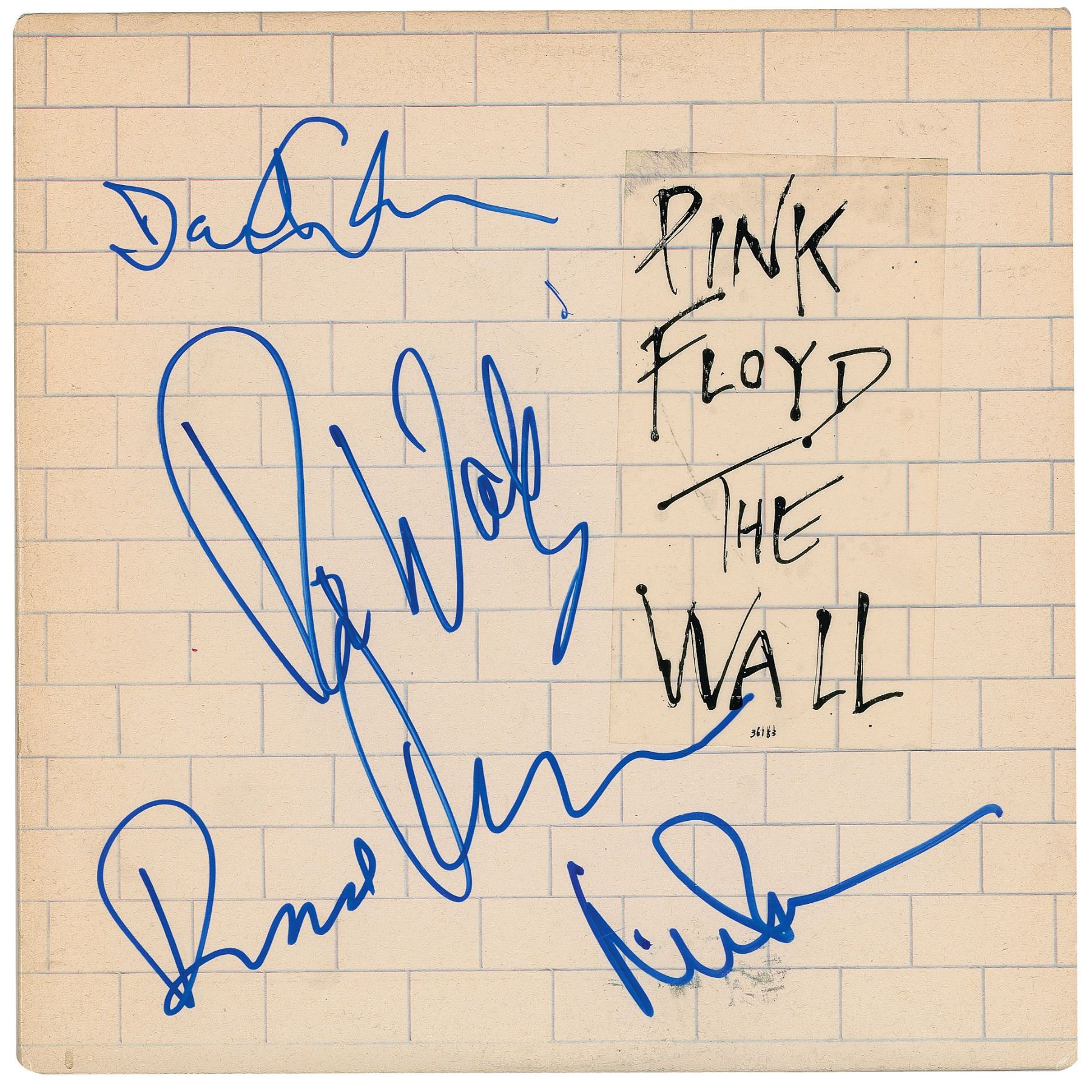Highly sought-after The Wall album signed prominently on the front cover in blue felt tip by David Gilmour, Nick Mason, Richard Wright, and Roger Waters. In fine condition, with the tail of Wright's signature extending on to the affixed Wall sticker. The records are included. The last studio album to feature Pink Floyd's classic early lineup, this fully signed record is enhanced furthermore by its cast of strikingly bold autographs against the sleeve's crisp and iconic background.
