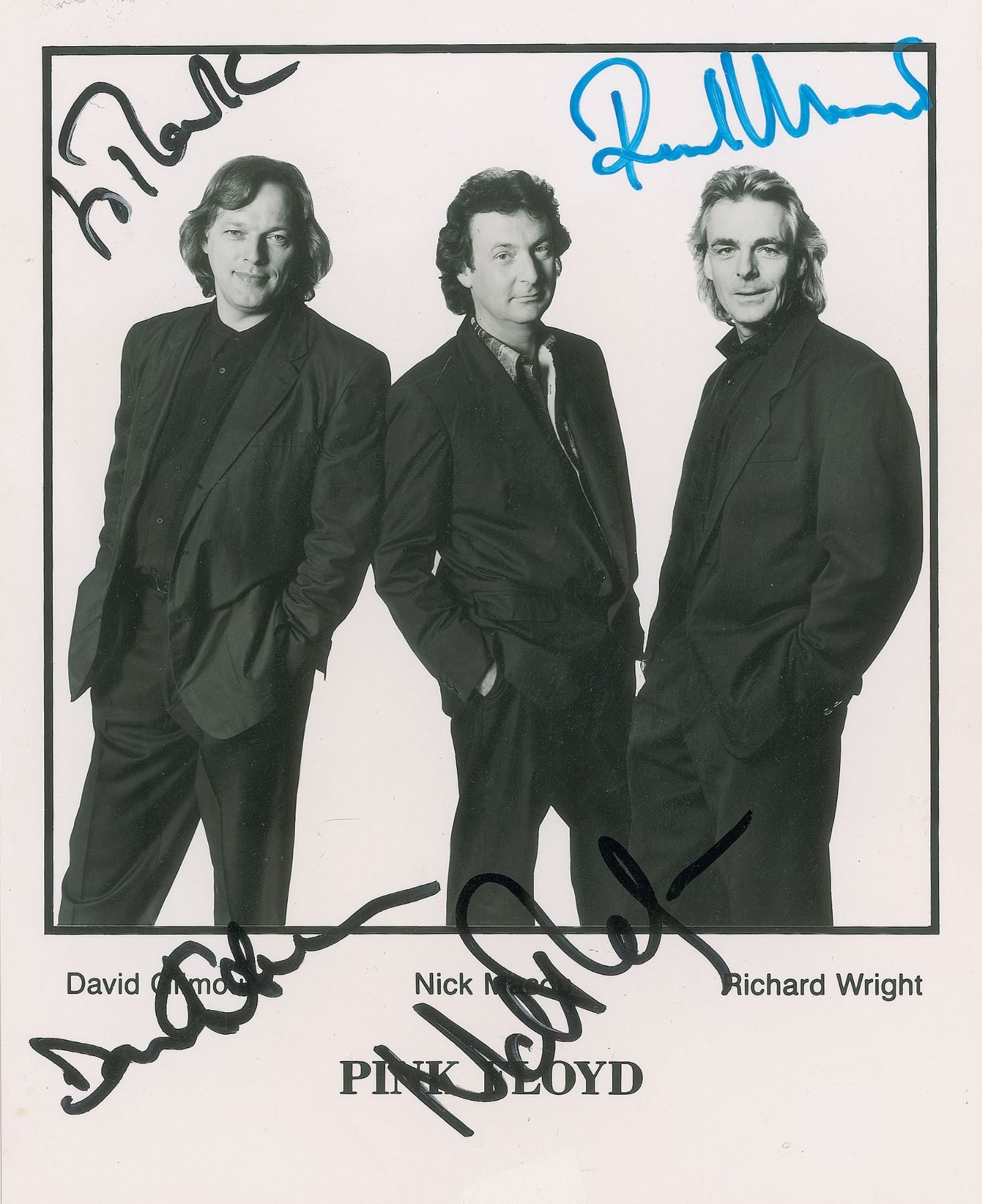 Satin-finish 8 x 10 promotional photo of Pink Floyd as a trio in the early 1990s, signed in black felt tip by David Gilmour and Nick Mason, and in blue felt tip by Richard Wright, with Mason adding the inscription "To Mark.” Consignor notes that the autographs were obtained by a roadie. In fine condition, with an area of surface loss in the middle of the bottom edge. Accompanied by a certificate of authenticity from Tracks.