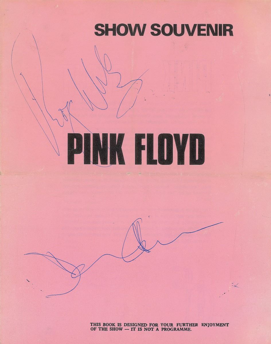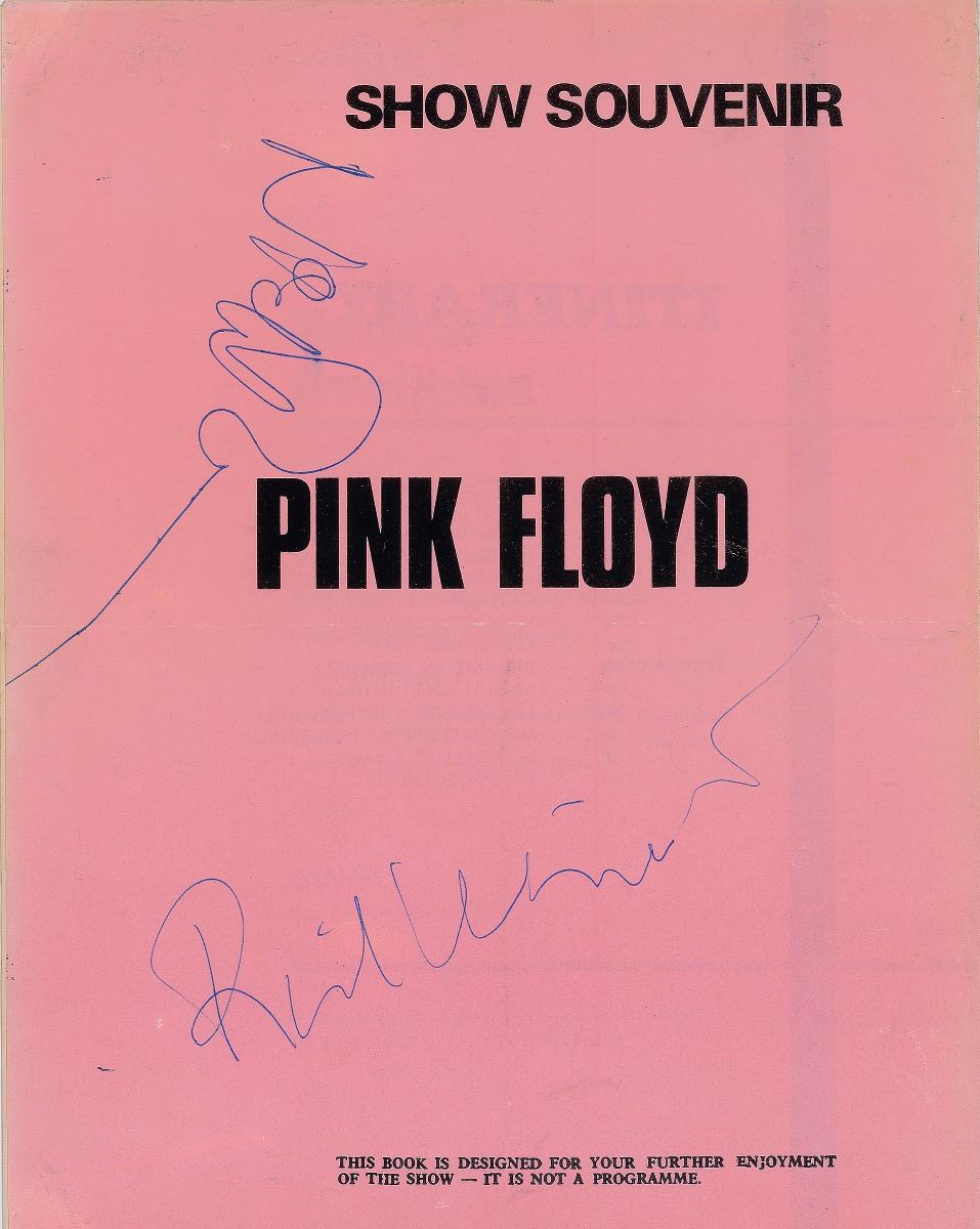 Accompanied by a certificate of authenticity from Tracks and a detailed letter of provenance from the original recipient, in part: “The first Pink Floyd concert I attended was at Leeds Town Hall on the 28th January 1972 and this was one of several venues making up the Pink Floyd’s UK winter tour 1972. This concert was all about Pink Floyd performing some of their most memorable music from the late 1960s but also performing Dark Side of the Moon, before its official launch on record in March 1973. I attended the concert with several friends studying at Leeds University who also knew roadies helping the band transport their equipment…as most were leaving the building my friends and I held back for a while and were invited to help remove some of the bands WEM speaker columns making part of the groups 360deg quadraphonic sound system…On completing the task we gathered around the bands 32 channel Allen and Heath sound mixing console weighing up the technology…the Floyd band members emerged and stood around the sound mixer for a chat with the sound engineers. Without hesitation the Pink Floyd concert programme was presented to each band member and on asking for their autographs they duly obliged. Whilst asking Roger Waters to sign I also plucked the courage to ask him what base guitar strings he used to this he replied ‘Rotosound.’ A friend also asked him about the main chord sequence for Interstellar Overdrive…and again he explained clearly the sequence.” An amazing and immensely rare piece not just of Pink Floyd history, but of music history itself—Dark Side of the Moon would go on to become the longest charting album ever released. A true Pink Floyd relic signed during a most pivotal period in the band’s history.