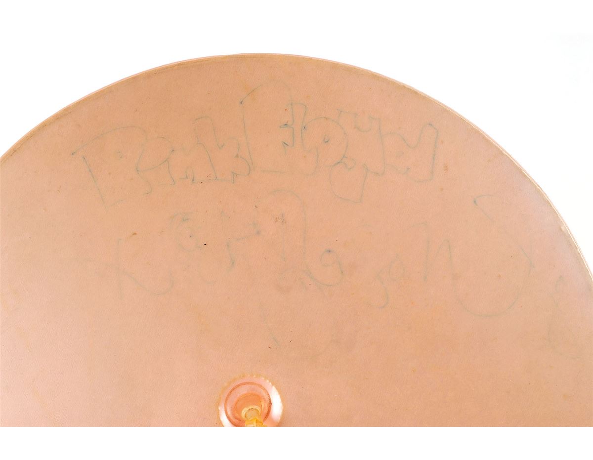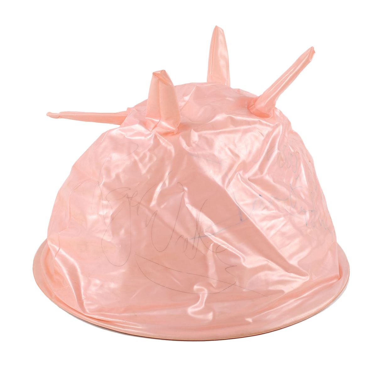 Original inflatable Pink Floyd cow’s udder, approximately 15? in diameter and 12? tall when inflated, used for the promotion of the band’s 1970 album Atom Heart Mother, signed on the udder in blue and black ballpoint by Roger Waters, David Gilmour, and Rick Wright, and on the base in blue ballpoint by Nick Mason, who adds “Pink Floyd” in bubble letters. Includes the original promotional box from Capitol Records and an unsigned color poster for Atom Heart Mother, 36 x 24, featuring an image of the bovine-related front cover. In overall fine condition, with slight soiling and the signatures faded but legible on the udder, and some tack holes, light dampstaining, and partial separations to expected storage folds to the poster. Nearly impossible to find with or without signatures, this udder ties in with Pink Floyd’s penchant for barnyard blowups; the band routinely utilized giant inflatable pigs during their legendary live shows.