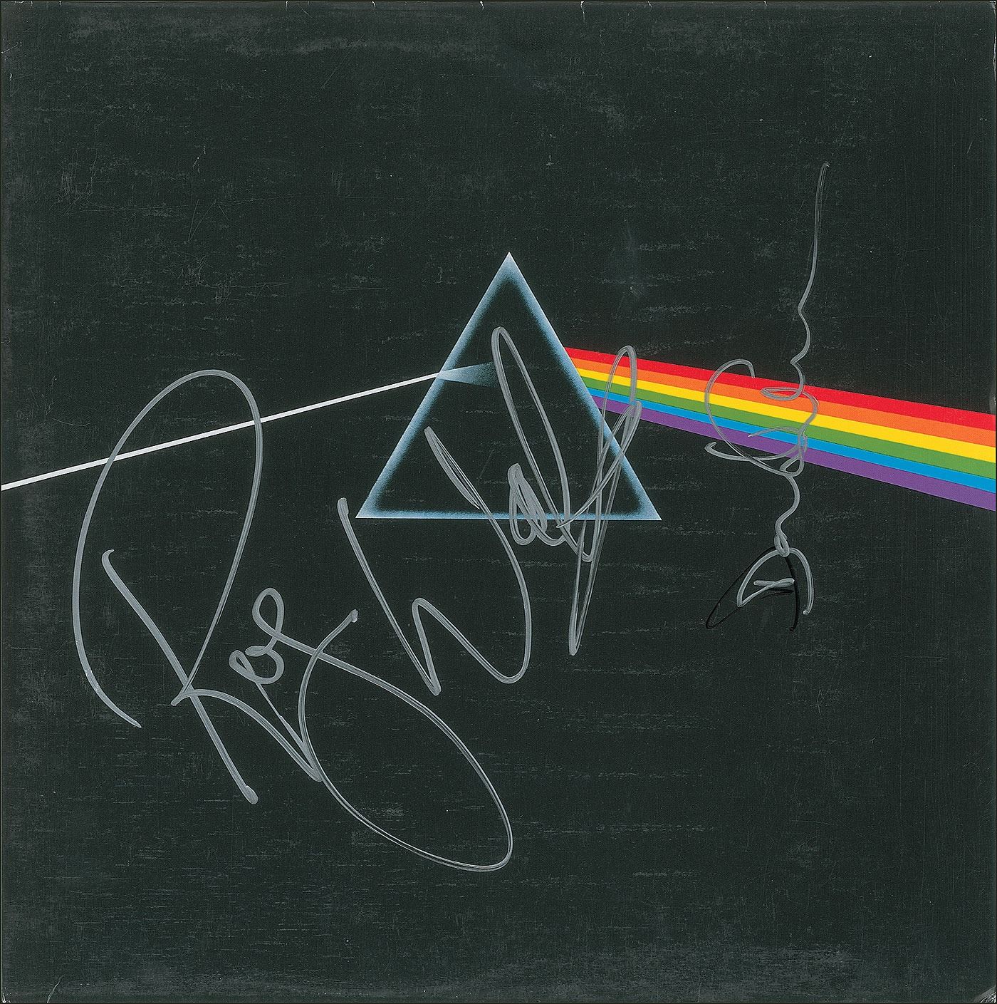 The Dark Side of the Moon album signed on the front cover in silver ink by Roger Waters and David Gilmour. In fine condition, with very light scuffing. The record is included.