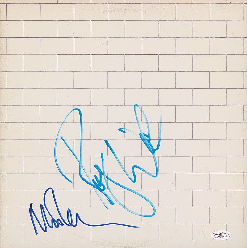 The Wall album signed on the front cover in blue felt tip by Roger Waters and Nick Mason. In fine condition, with a few creases, some light surface loss to back cover, and a James Spence authentication label affixed to lower corner. The record is included. Accompanied by a letter of authenticity from James Spence.