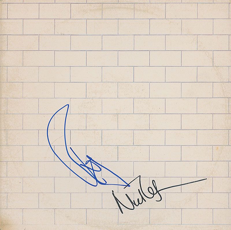 The Wall album signed on the front cover in blue felt tip by Roger Waters and in black felt tip by Nick Mason. ‘Ring of wear’ to front cover as well as some scattered light soiling, otherwise fine condition. The record is not included.
