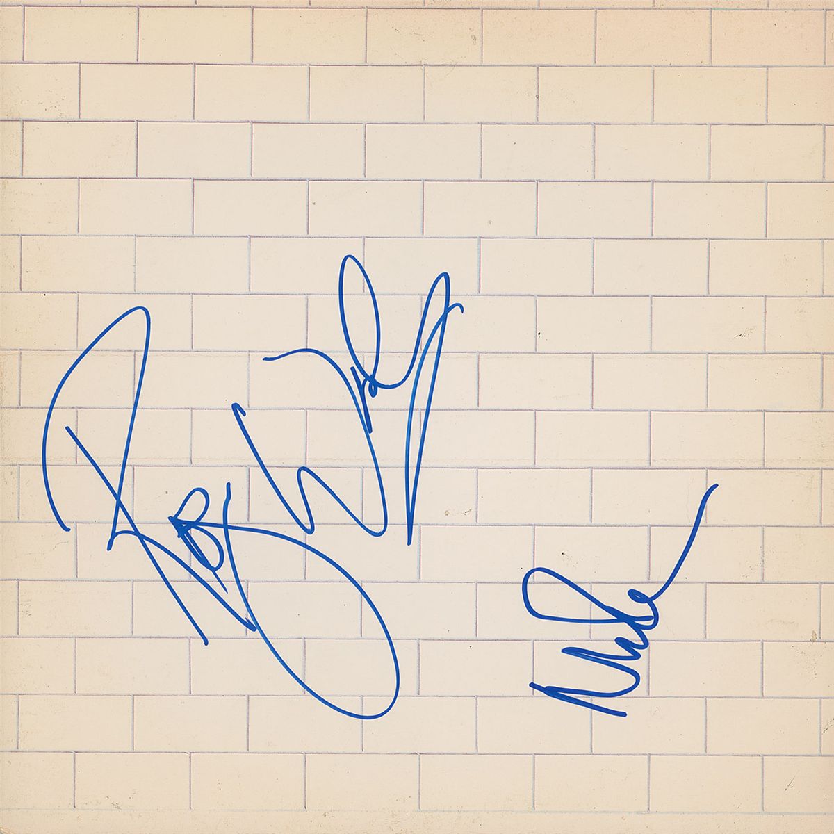 The Wall album signed on the front cover in blue felt tip by Roger Waters and Nick Mason. In fine condition, with easily repairable partial splits to the top and bottom edges. Both records are included.