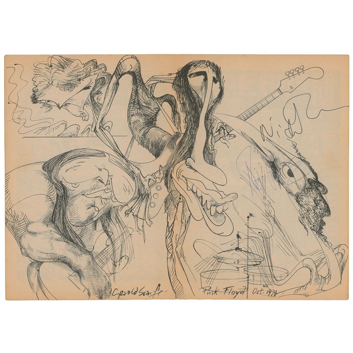 Scarce comic book–style program for Pink Floyd’s 1974 UK tour, 8.25 x 11.75, 16 pages, signed on the psychedelic centerfold image in blue ballpoint by Roger Waters and in black felt tip by Nick Mason. Mild overall toning and some scattered foxing to covers, otherwise fine condition. An unusual, desirable format.