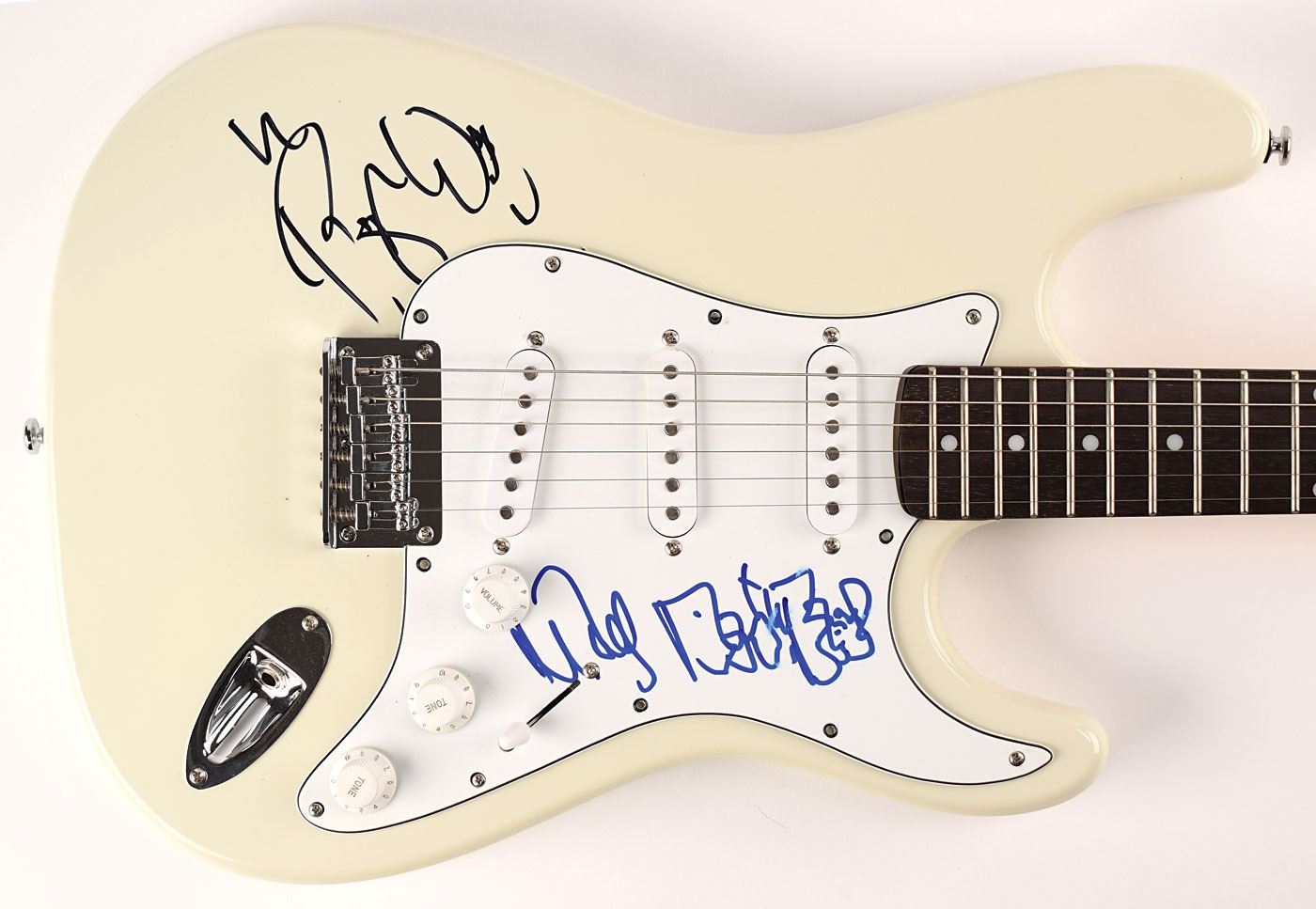 White-bodied Fender Squier Bullet Stratocaster electric guitar, signed on the body in black felt tip by Roger Waters and on the pickguard in blue felt tip by Nick Mason, who adds "Pink Floyd." In fine condition, with a couple small smudges to Mason addition. Accompanied by a full letter of authenticity from JSA.