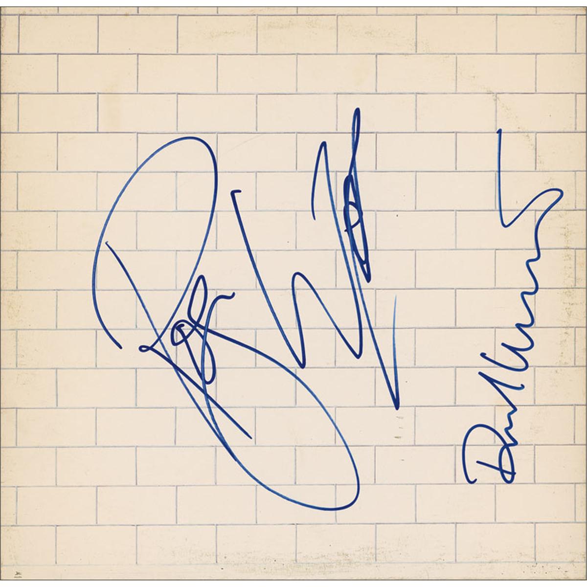 The Wall album signed on the front cover in blue felt tip by Roger Waters and Rick Wright. In fine condition, with light ‘ring of wear’ to cover as well as a bit of scattered light soiling. The record is included.