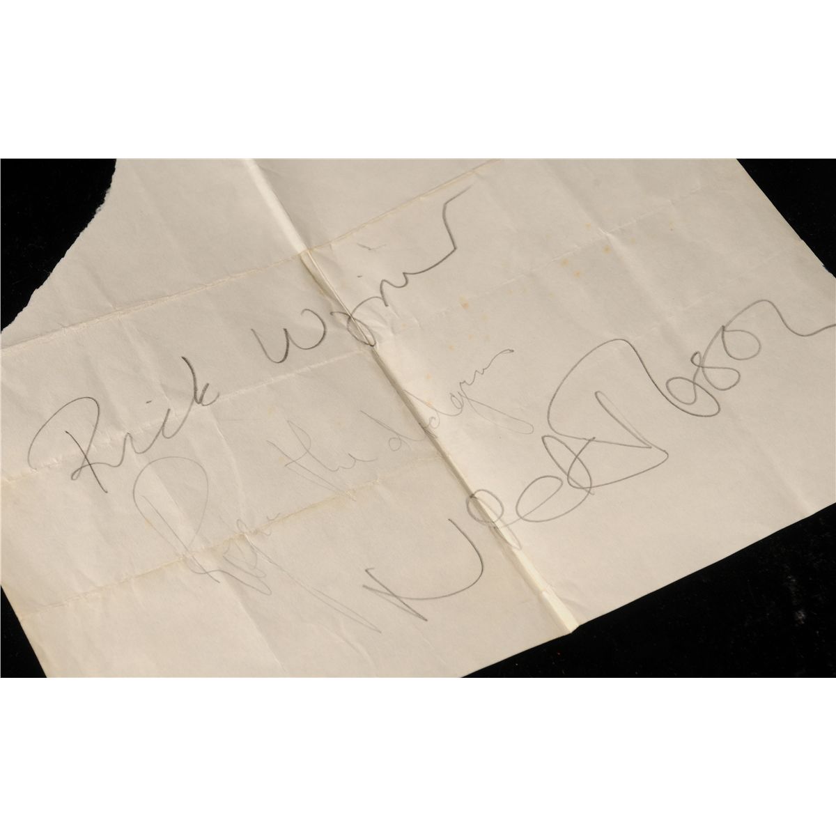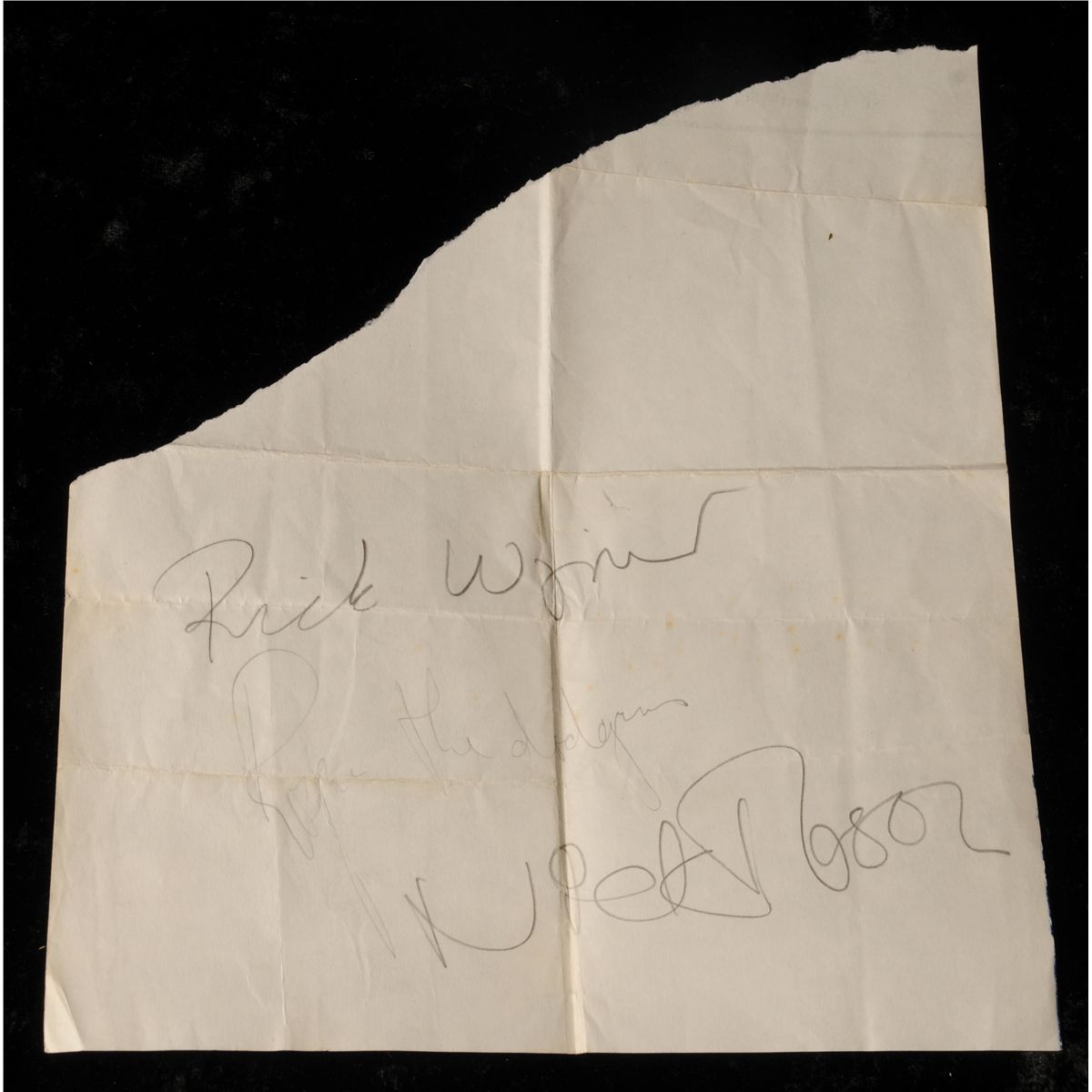 a piece of white paper signed Rick Wright, Nick Mason and Roger the Dodger (Waters), all in pencil