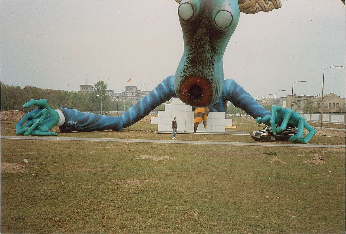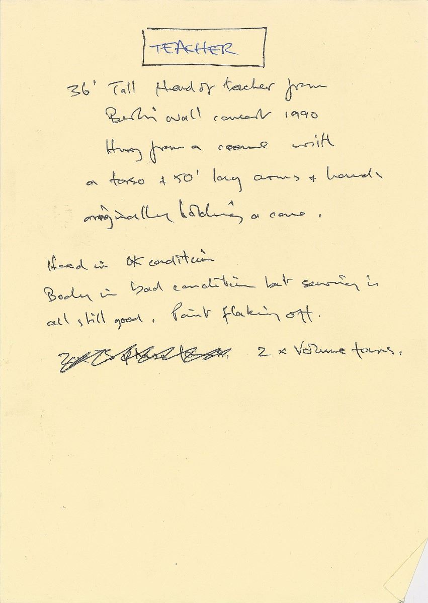 Enormous inflatable prop of the ‘Teacher’ used in the stage design for the famous concert ‘The Wall: Live in Berlin,’ performed by Roger Waters and numerous guest artists on July 21, 1990, to commemorate the fall of the Berlin Wall. The massive inflatable consists of a 36´ tall head, 20´ tall torso, and 50´ long arms and hands, and was draped over the background of the stage during the show. Includes four original candid photos of it being set up in the Potsdamer Platz before the concert. Condition of the inflatable is generally good without any punctures and the sewing remains strong throughout. While the head and face are in very good shape, the arms and body are in worse condition with paint flaking off. Accompanied by a letter of provenance from the maker. The inflatable is stored within two flight cases and includes fans for inflation. Item is currently located in England and the buyer is responsible for all associated shipping costs.