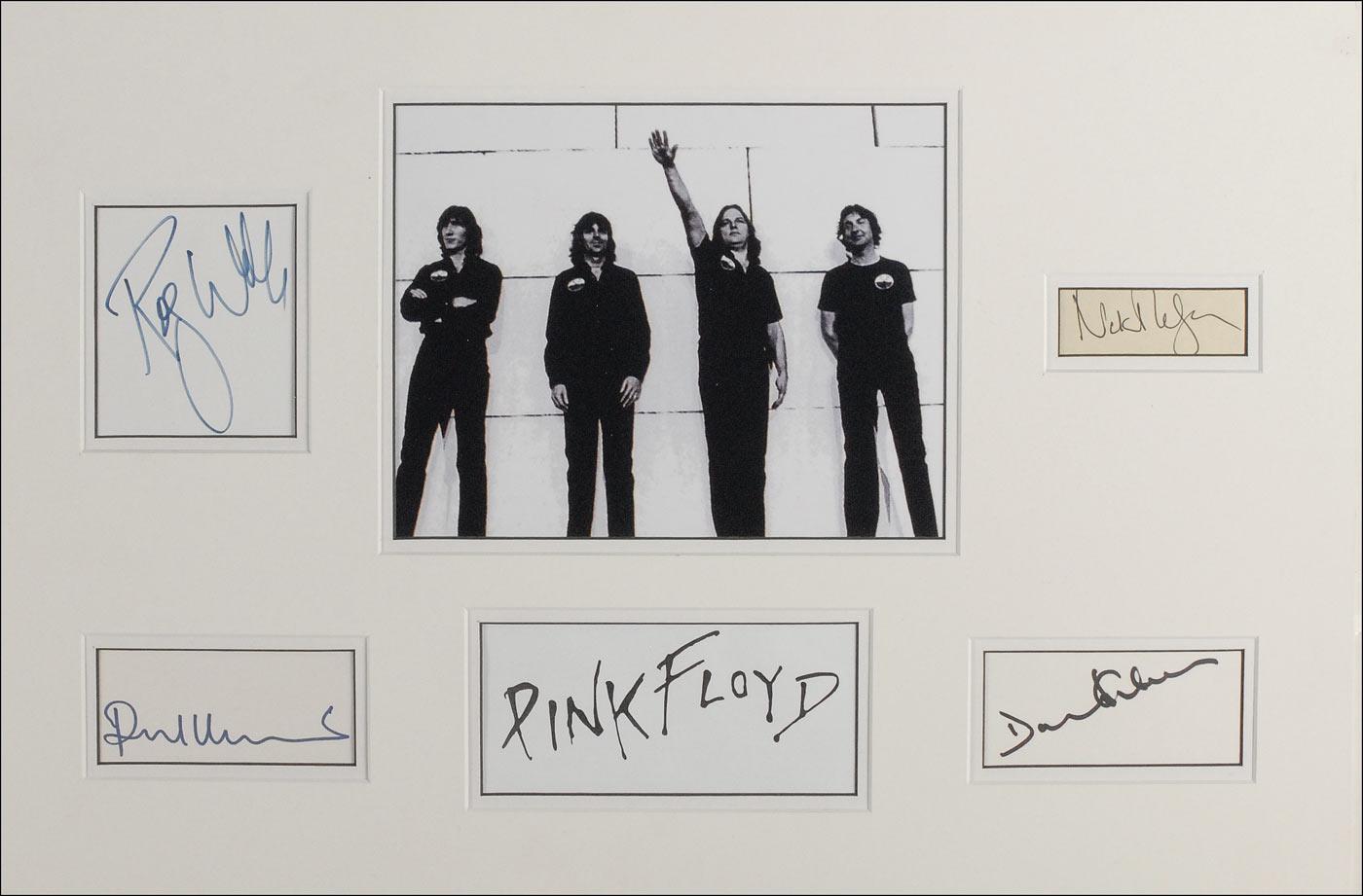 Felt tip signatures of Roger Waters, David Gilmour, Nick Mason, and Rick Wright on individual off-white cards. Double-matted with the band’s name and a group photo and mounted to a piece of foam core to an overall size of 24 x 16. In fine condition.