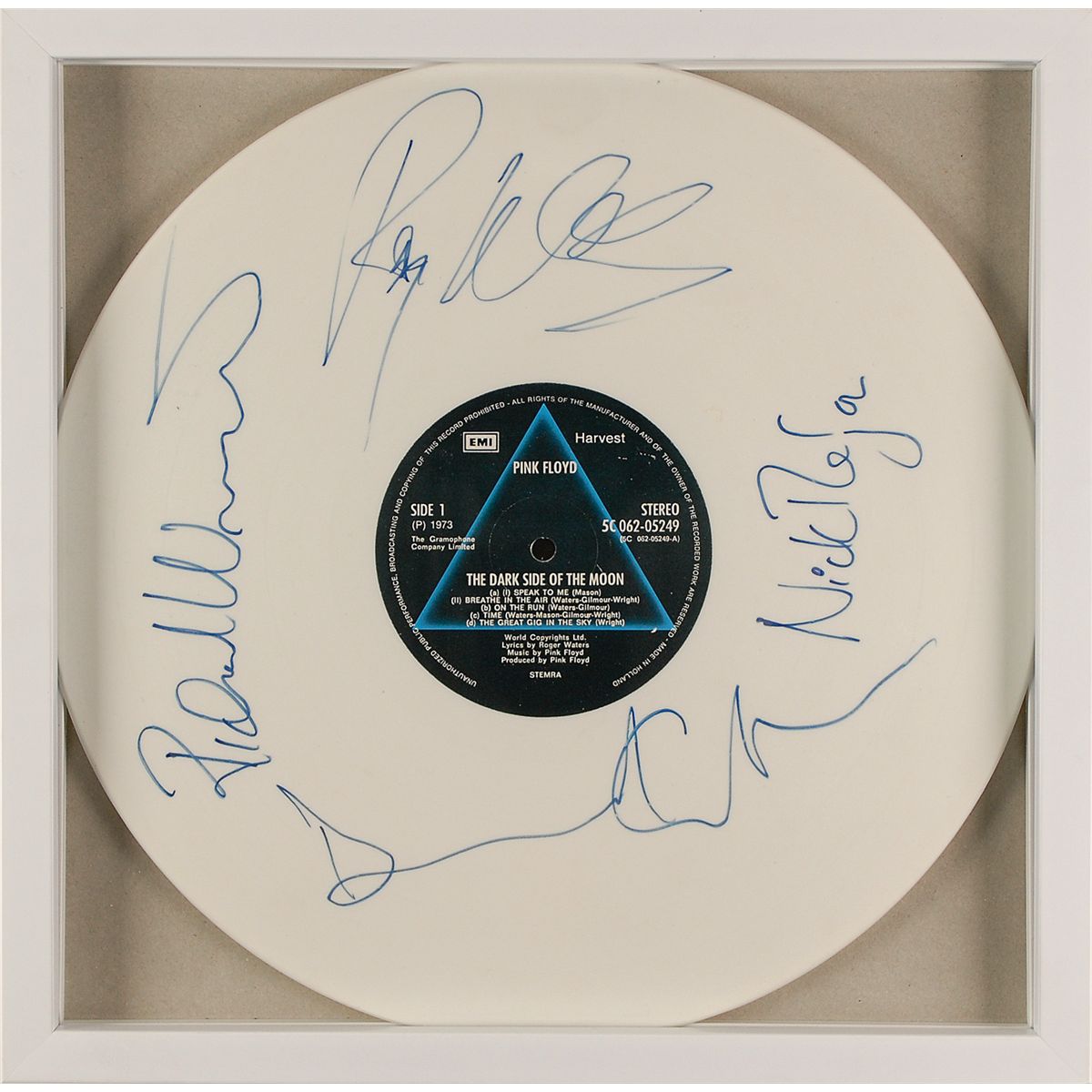 Scarce Dark Side of the Moon (1973 Dutch 9-track white vinyl LP with EMI/Harvest black labels featuring the blue triangle design) signed on the album in blue felt tip Roger Waters, David Gilmour, Nick Mason, and Rick Wright. In fine condition.