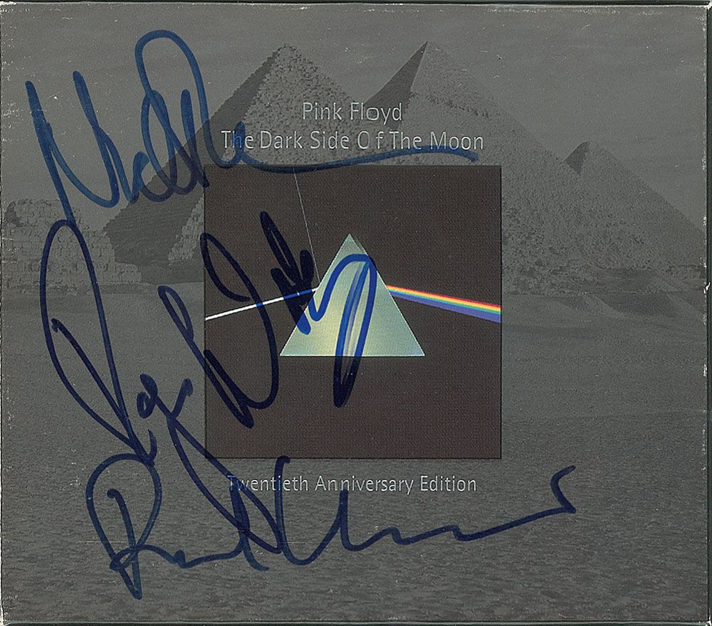 The Dark Side of the Moon 20th Anniversary edition CD signed on the front cover in blue felt tip by Roger Waters, Nick Mason, and Richard Wright. In fine condition. The CD is not included. Accompanied by a letter of authenticity from James Spence.