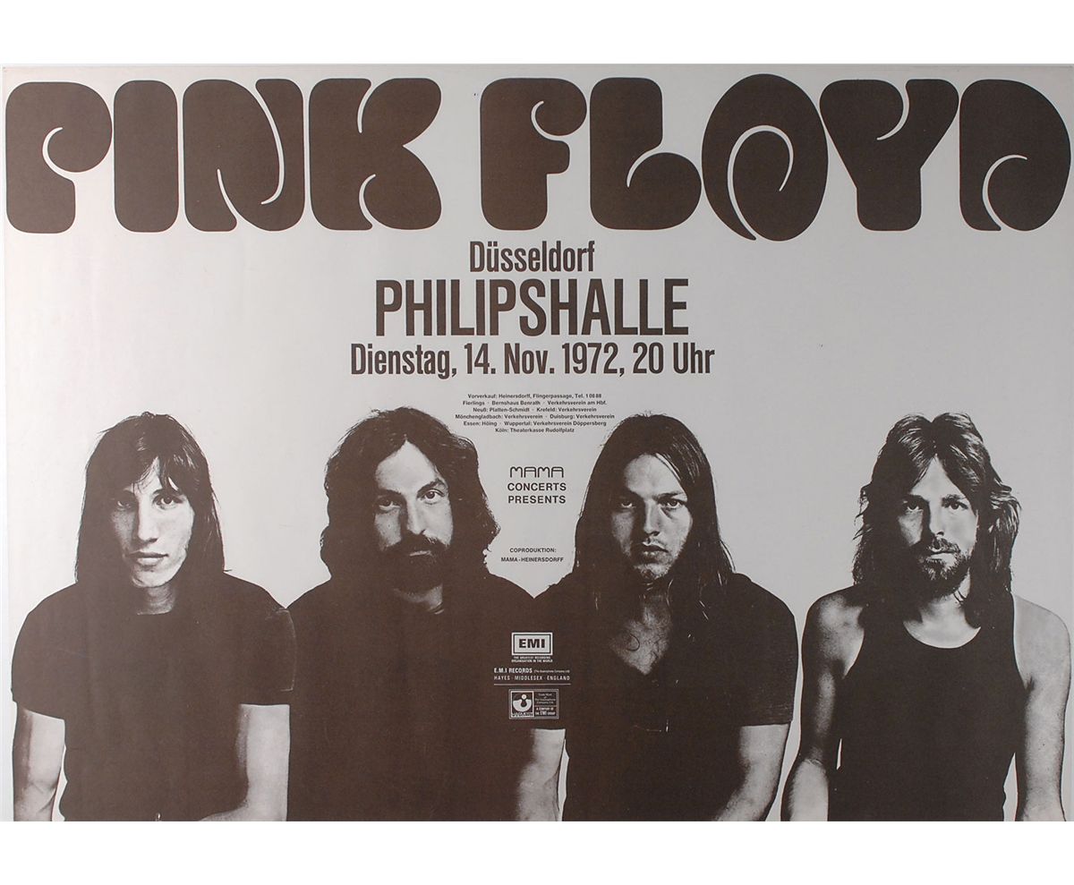 Original 33 x 23.5 poster for Pink Floyd’s November 14, 1972, concert at the Philipshalle in Düsseldorf, Germany, as part of their Dark Side of the Moon tour. Poster features an image of the band at the bottom and venue and ticket information printed at the top. In fine condition. Rolled.
