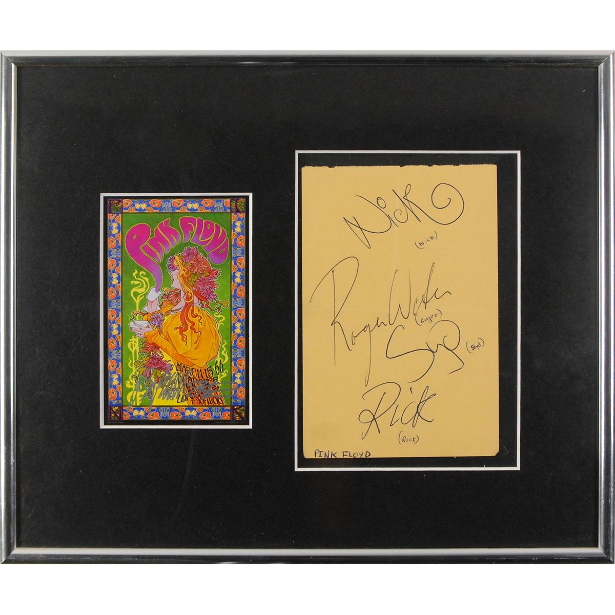 Scarce vintage ballpoint signatures, “Syd,” “Rick,” “Nick,” and “Roger Waters,” on a light yellow 4 x 6 album page, with small collector’s notations around signatures. Matted and framed with a small reproduction of a 1966 concert poster, signed in silver ink by artist Bob Masse, to an overall size of 12.75 x 10.75. In fine condition, with a light central vertical fold.