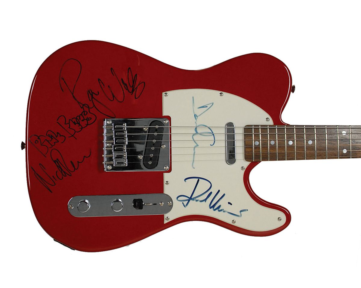 Red-bodied Fender Squier ‘telecaster-style’ electric guitar, signed on the body in black felt tip by Roger Waters and Nick Mason, who adds the band’s name in balloon letters, and signed on the off-white pickguard by David Gilmour and Rick Wright. In fine condition, with a trivial brush to Waters’s signature. Accompanied by a full letter of authenticity from Roger Epperson/REAL. Complete band-signed instruments are rather uncommon. Oversized.