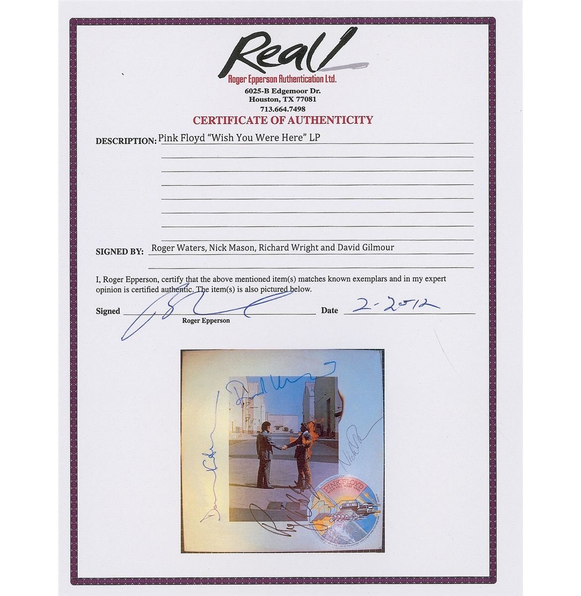 Wish You Were Here album signed on the front cover in black felt tip by Roger Waters, in blue felt tip by Dave Gilmour and Rick Wright, and in black ballpoint by Nick Mason. Mild ‘ring of wear’ to covers, promotional label affixed to front cover, some scattered edge wear, and a label from well-known Houston music autograph dealer Rick Barrett affixed to back cover, otherwise fine condition. The record is not included. Accompanied by a full letter of authenticity from Roger Epperson/REAL.