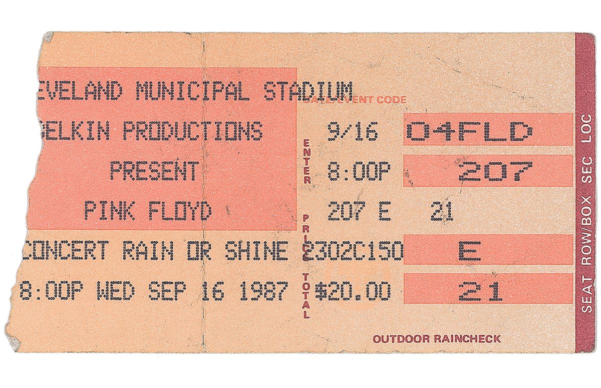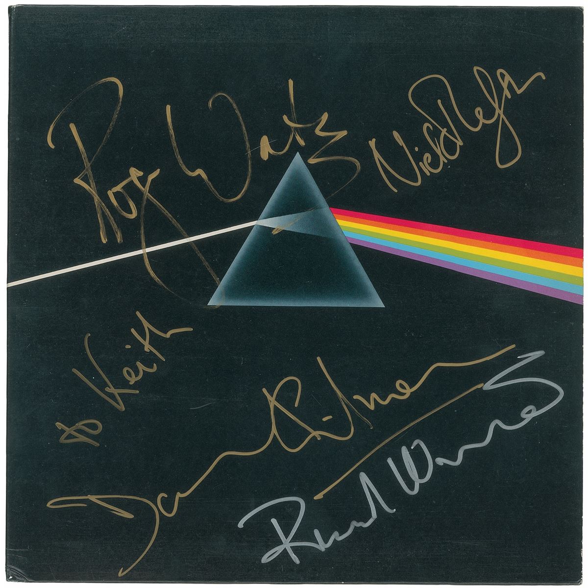 Dark Side of the Moon album signed and inscribed on the front cover in gold ink, “To Keith, David Gilmore,” “Roger Waters,” “Nick Mason,” and in silver ink, “Richard Wright.” In fine condition, with some creasing to lower left corner, and slight irregular ink adhesion to portions of Waters’s signature. The record is included. Consignor notes that the Gilmore, Wright, and Mason signatures were obtained following a concert at the Cleveland Municipal Stadium in 1987; the Waters signature was obtained at a later date. Accompanied by a ticket stub from the aforementioned performance. A boldly signed example of their groundbreaking album, which spent an unprecedented 741 weeks on the Billboard charts.