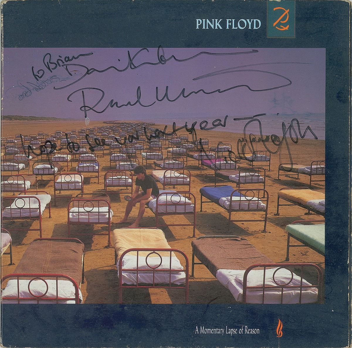 A Momentary Lapse of Reason album signed and inscribed on the front cover in black felt tip, “To Brian, David Gilmore,” “Richard Wright,” and “Hope to see you next year—Nick Mason.” In very good to fine condition, with Gilmour signing over a failed first attempt, and a ballpoint notation in an unknown hand. The record is included. Accompanied by a full letter of authenticity from JSA, as well as a transmittal letter from the band’s management coordinator, dated November 4, 1987.