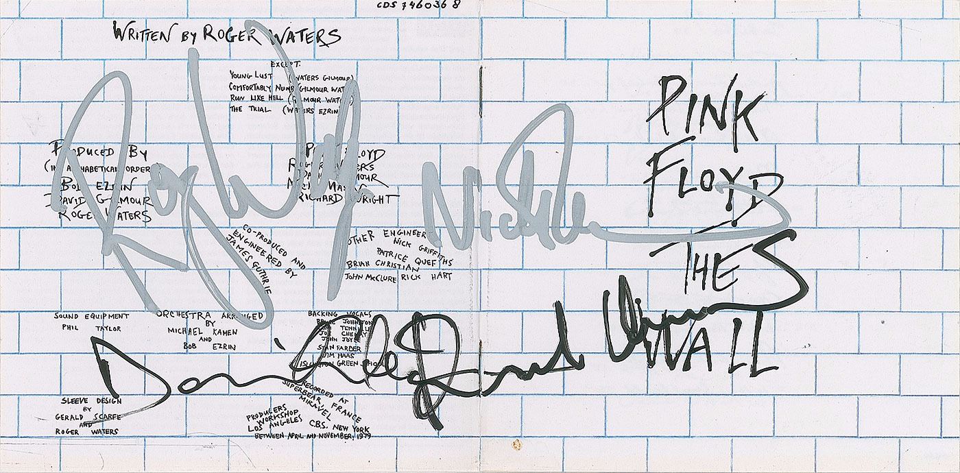 The Wall CD booklet signed on the front and back in silver ink by Roger Waters and Nick Mason, and in black felt tip by David Gilmour and Richard Wright. In fine condition. The CD is not included. Accompanied by a full letter of authenticity from JSA.