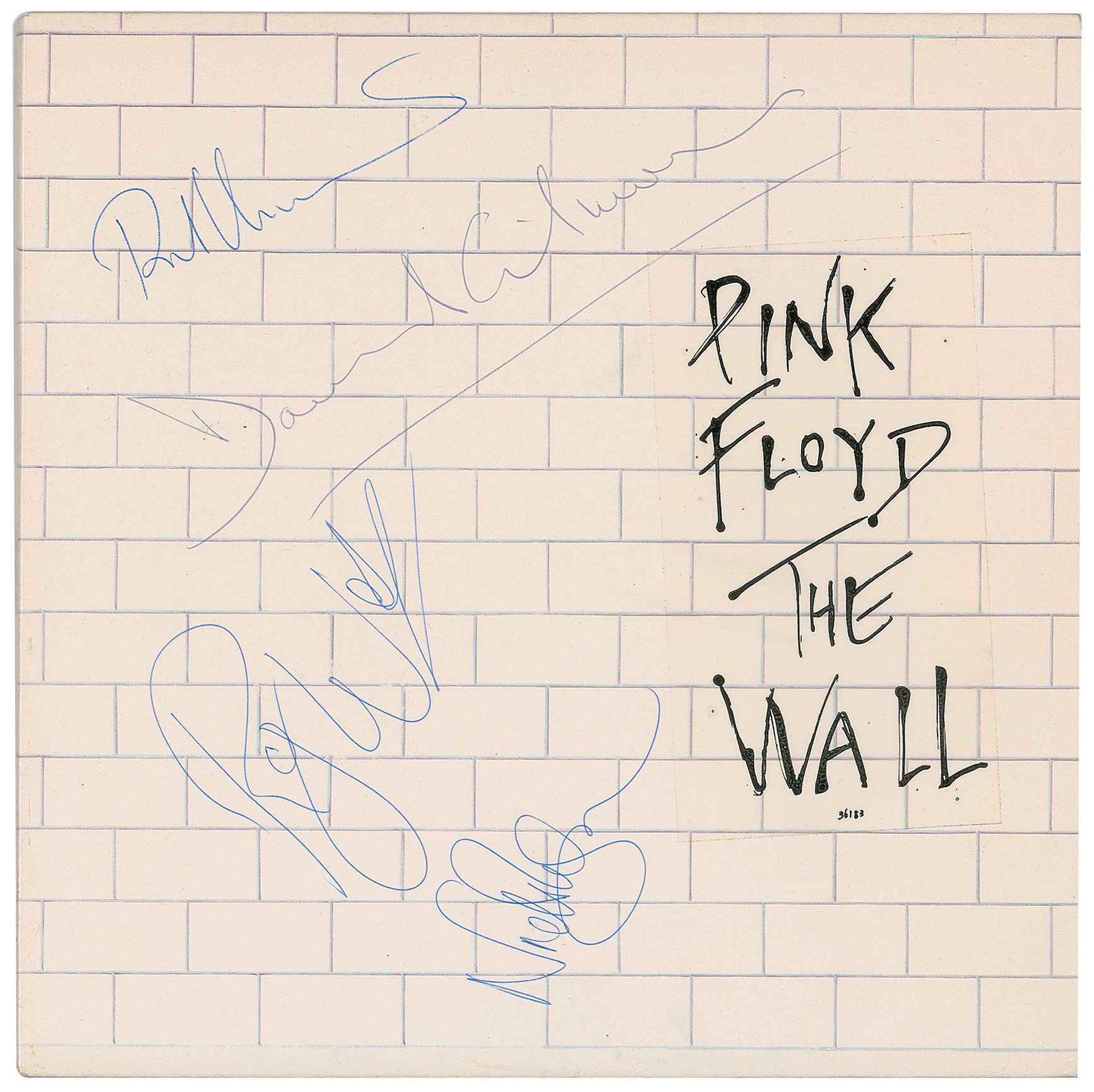 Highly sought-after The Wall promotional album by Pink Floyd, signed neatly on the front cover in black ballpoint by David Gilmour, and in blue ballpoint by Roger Waters, Nick Mason, and Richard Wright. In very fine condition. The record is included. The last studio album to feature Pink Floyd's classic early lineup, this fully signed record is enhanced furthermore by a cast of crisp autographs against the sleeve's iconic background—albums signed by all four members are becoming increasingly rare, especially so given that Waters and Gilmour routinely refuse to autograph items the other has already signed. Accompanied by a full letter of authenticity from Perry Cox, which notes the dates of each signing: Mason at Studio Instrument Rentals in Hollywood on February 17, 2008; Waters at Il Sole in West Hollywood on April 26, 2008; Wright at the Hartsfield-Jackson Atlanta International Airport on May 12, 2008; and Gilmour in New York City in May 1984.