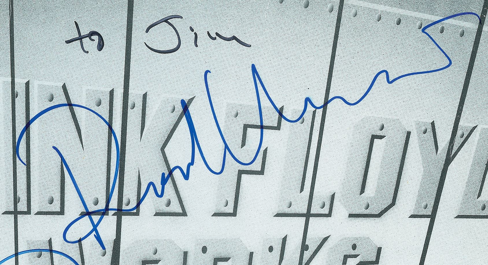 Works compilation album by Pink Floyd, signed and inscribed on the front cover in black felt tip, "To Jim, David Gilmour," and in blue felt tip, "Roger Waters," "Richard Wright," and "Nick Mason." In fine condition, with light creasing along the edges. The record is included. A decidedly uncommon Pink Floyd album. Accompanied by a full letter of authenticity from JSA.