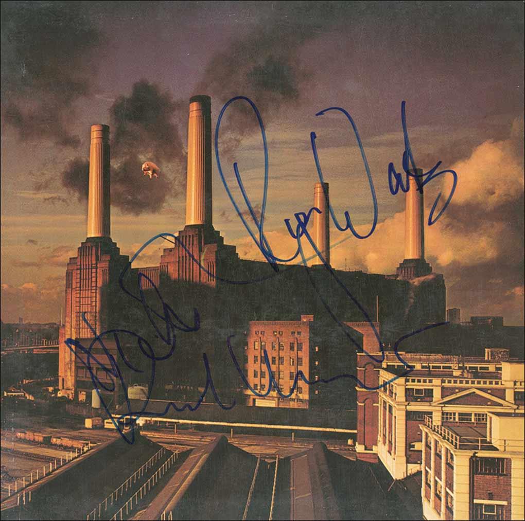 Animals album signed on the front cover in blue felt tip by Roger Waters, Nick Mason, and Rick Wright. In fine condition, with a bit of light contrast to a couple of signatures. The record is included.