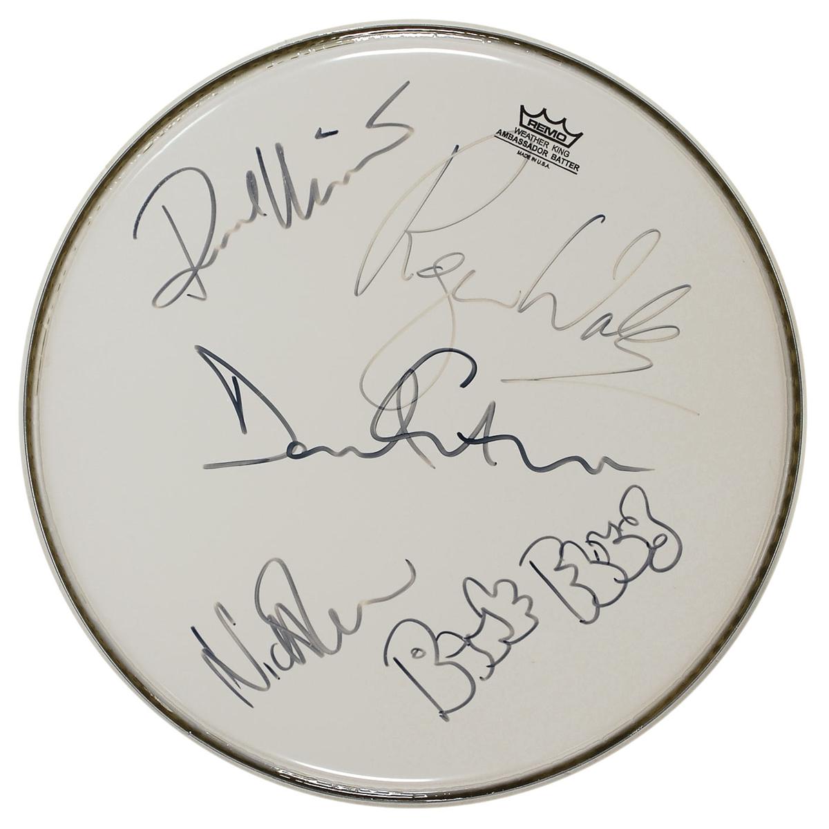 Unused off-white Remo 14” drumhead, signed in black felt tip by Roger Waters, David Gilmour, Rick Wright, and Nick Mason, adding the band’s name in bubble letters under his signature. In fine condition.