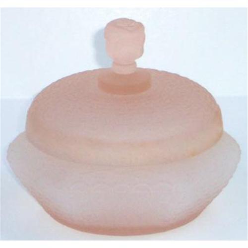 The lid and base of this lovely pale pink frosted glass powder jar have an intricate basket weave design. The finial is a raised rounded rose figural. The jar has a hexagonal shape and the lid is round. This unusual pink frosted Depression Glass powder jar, with its lid, measures about 4" tall x 4" in diameter and both are in excellent condition.