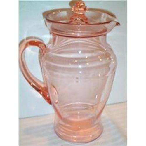 This very STUNNING and scarce Pink Depression Glass Lidded Lemonade Pitcher is in SUPERIOR condition with no chips, cracks, or dings and it measures 8.50" from spout to handle and stands 11" tall to the top of its finial on the lid of the pitcher.