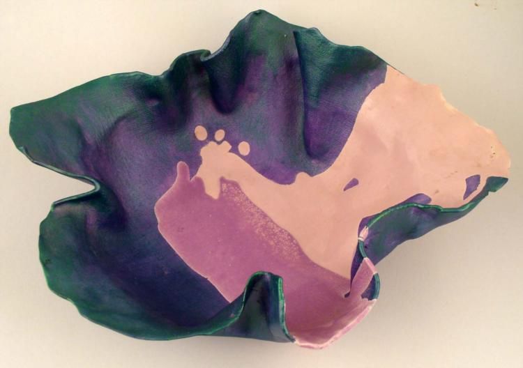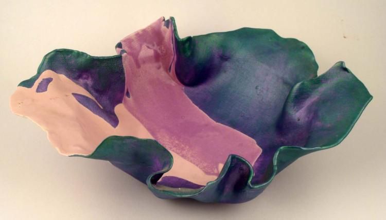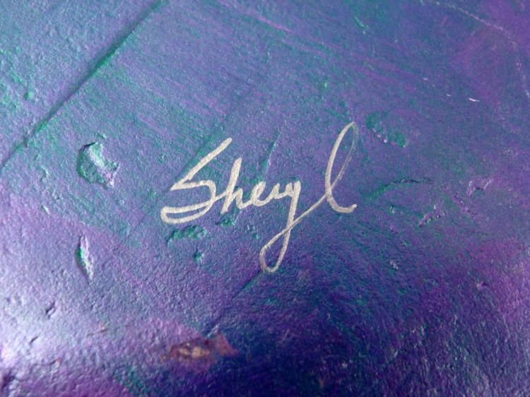This glass and fabric textured bowl has a wavy, free-form style, with irridescent purple/green, and pink paint. * Artist: Signed "Sheryl" on the bottomMedium: Glass with fabric, giving it texture, and paintDimensions: Up to 16" across, and 5" tallCondition: Excellent