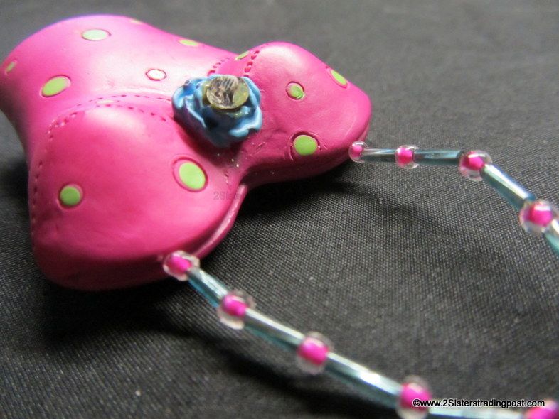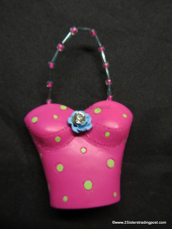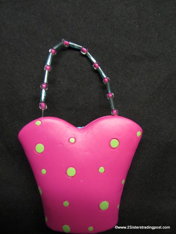 Solid molded handbag. This bag is molded like a bodice in hot pink with green polka dots a