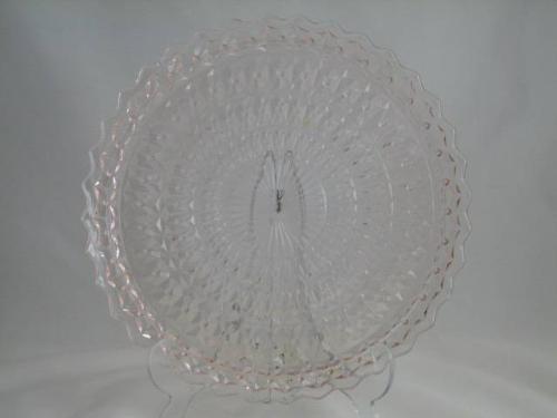Pink Depression Sandwich Tray 10.5". Pattern - HOLIDAY/ BUTTONS AND BOWS. Produced 1947-1949 by Jeannette Glass Company - Jeannette, Pennsylvania. No chips, cracks, or scratches.