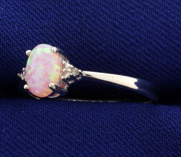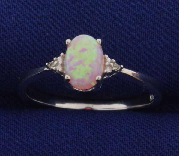 Genuine 5x7mm oval lab Opal with gorgeous pink color ring accented with 0.01cts genuine diamond. Set in Platinum over Sterling Silver, size 7. 1.5g