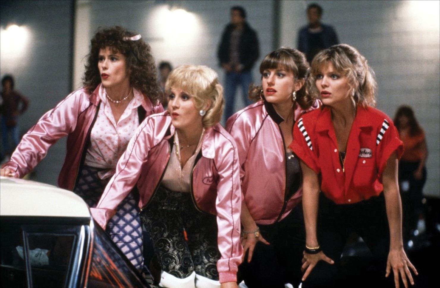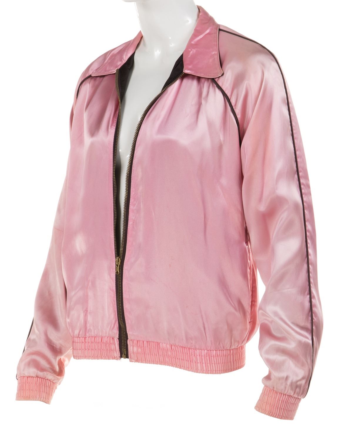 147. Pink Ladies jacket from Grease 2, also featured on an episode of Deal or No Deal. (Paramount, 1982) Vintage original pink satin jacket with pointed collar, elastic hem and cuffs, black piping on chest, back and down sleeves, and zipper front closure. Black embroidery on reverse reads, "Pink Ladies". Interior lined in black satin. Exhibiting very light fading and production wear. In vintage very good condition. Featured as a prize on Deal or No Deal. Exhibitied: Harrah's Showboat Casino, Atlantic City, NJ. $4,000 - $6,000