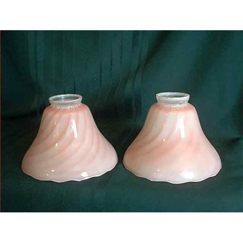 Light covers of soft pink color with swirl design. These 2 pretty light covers measure 5.5 inches high and 7.25 inches wide at the largest part. They do have small nicks around the edge where they fit into the light bracket but other than that they are in very good condition with no chips or cracks